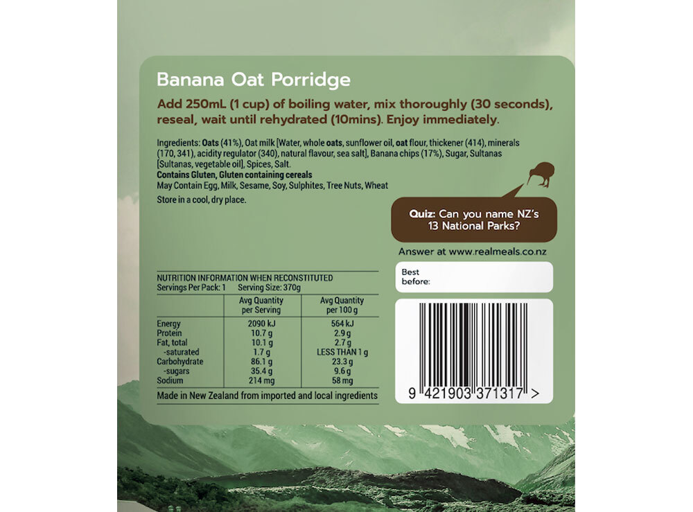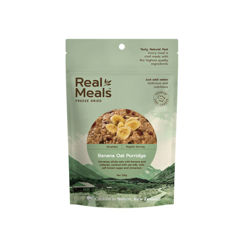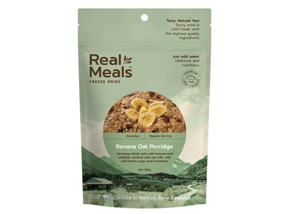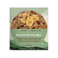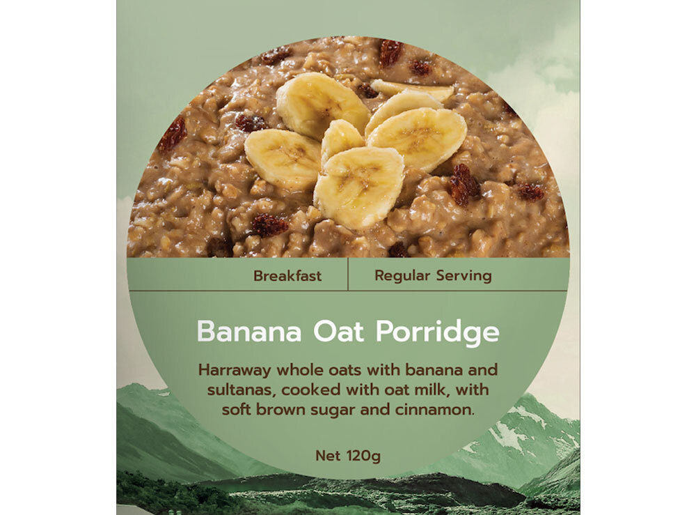 The Real Meals Banana Oat Porridge contains harraway whole oats with banana and sultanas, cooked with oat milk, with soft brown sugar and cinnamon.