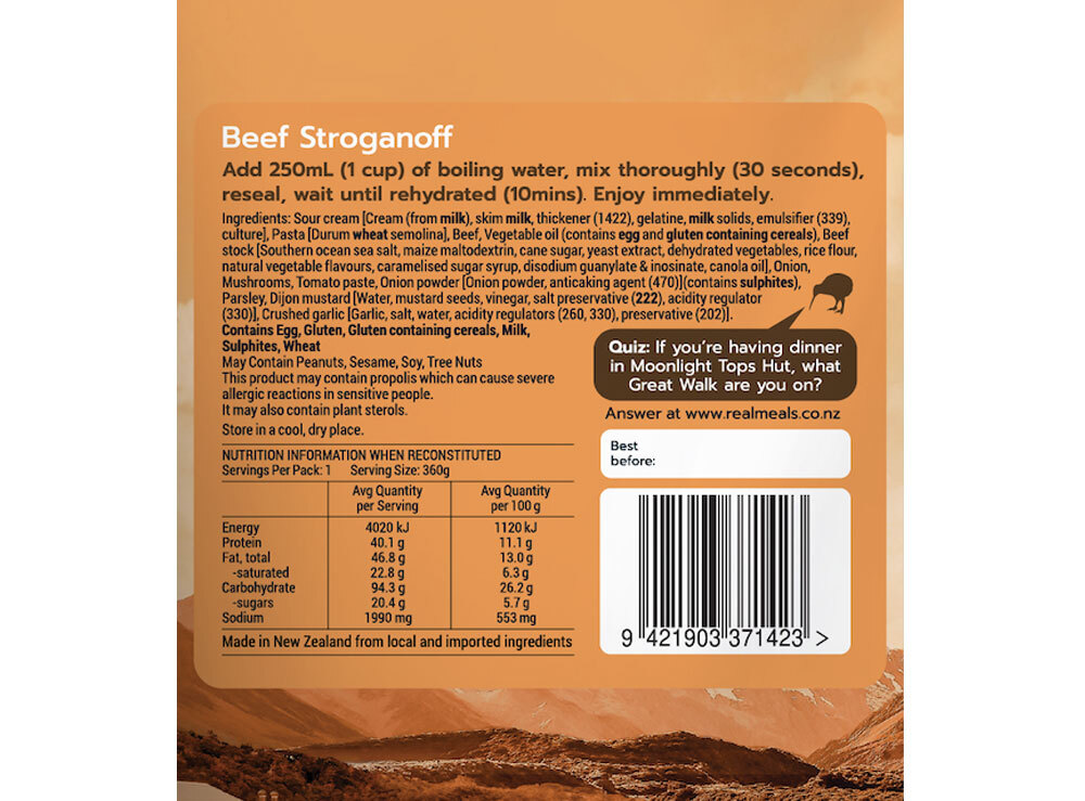 Sour cream [Cream (from milk), skim milk, thickener (1422), gelatine, milk solids, emulsifier (339), culture], Pasta [Durum wheat semolina], semolina], Beef, Vegetable oil (contains egg and gluten containing cereals), Beef stock [Southern ocean sea salt, maize maltodextrin, cane sugar, yeast extract, dehydrated vegetables, rice flour, natural vegetable flavours, caramelised sugar syrup, disodium guanylate & inosinate, canola oil] Onion, Mushrooms, Tomato paste, Onion powder [Onion powder, anticaking agent (470)](contains sulphites), Parsley, Dijon mustard [Water, mustard seeds, vinegar, salt preservative (222), acidity regulator (330)], Crushed garlic [Garlic, salt, water, acidity regulators (260, 330), preservative (202)]