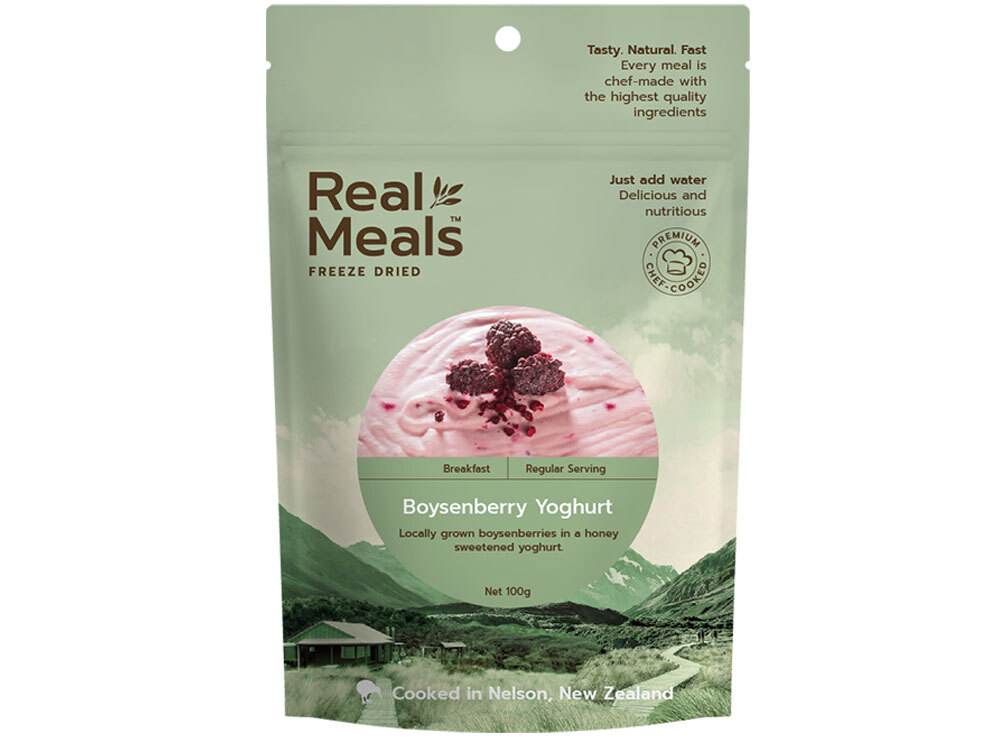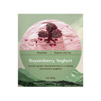 The Real Meals Boysenberry Yoghurt is made from locally grown boysenberries in a honey sweetened organic yoghurt.