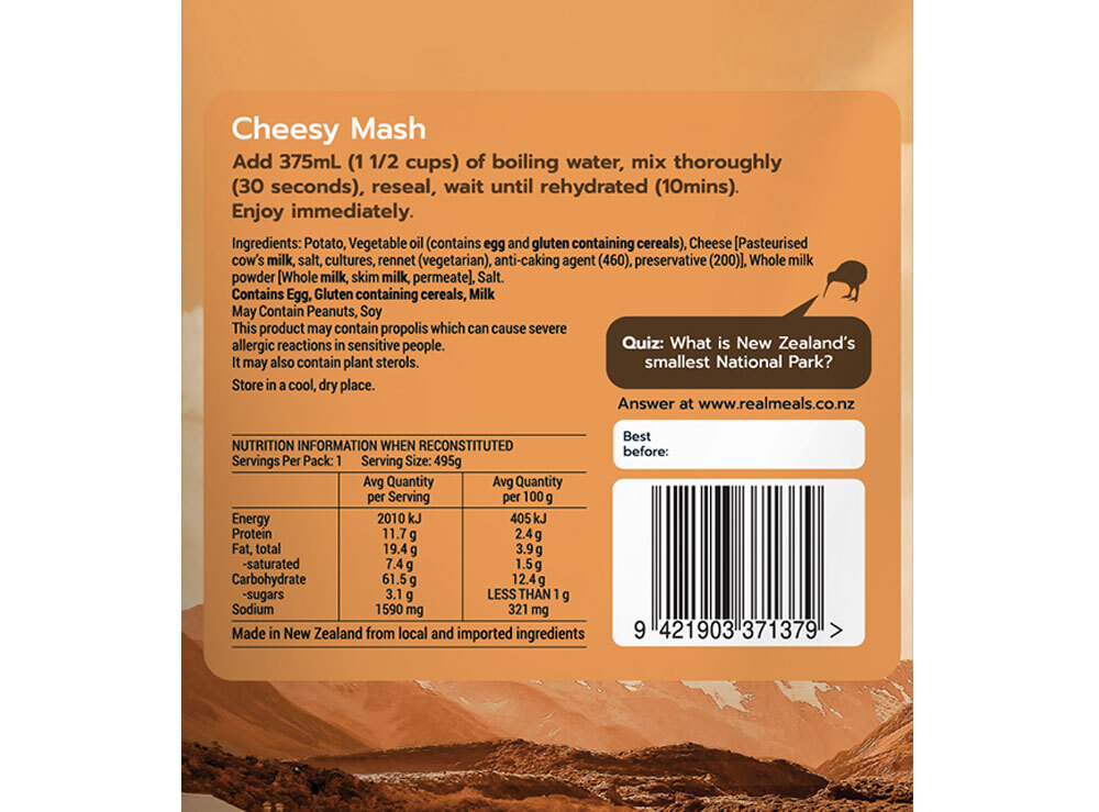 Real Meals Cheesy Mash is a creamy mash of Agria potatoes with New Zealand tasty cheese.