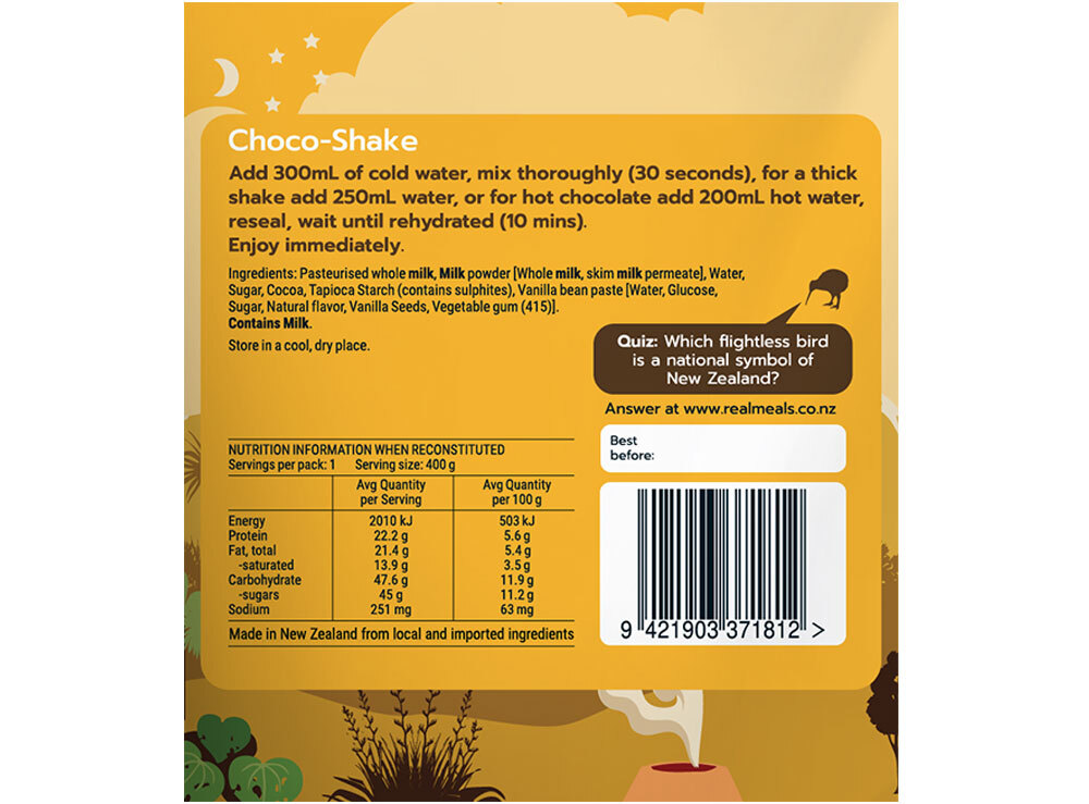 The Real Meals Choco-Shake is a delicious Chocolate drink. Made with creamy milk, rich cocoa, and a hint of vanilla, enjoy hot, or cold.