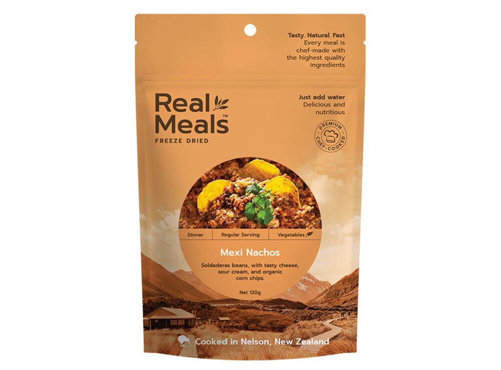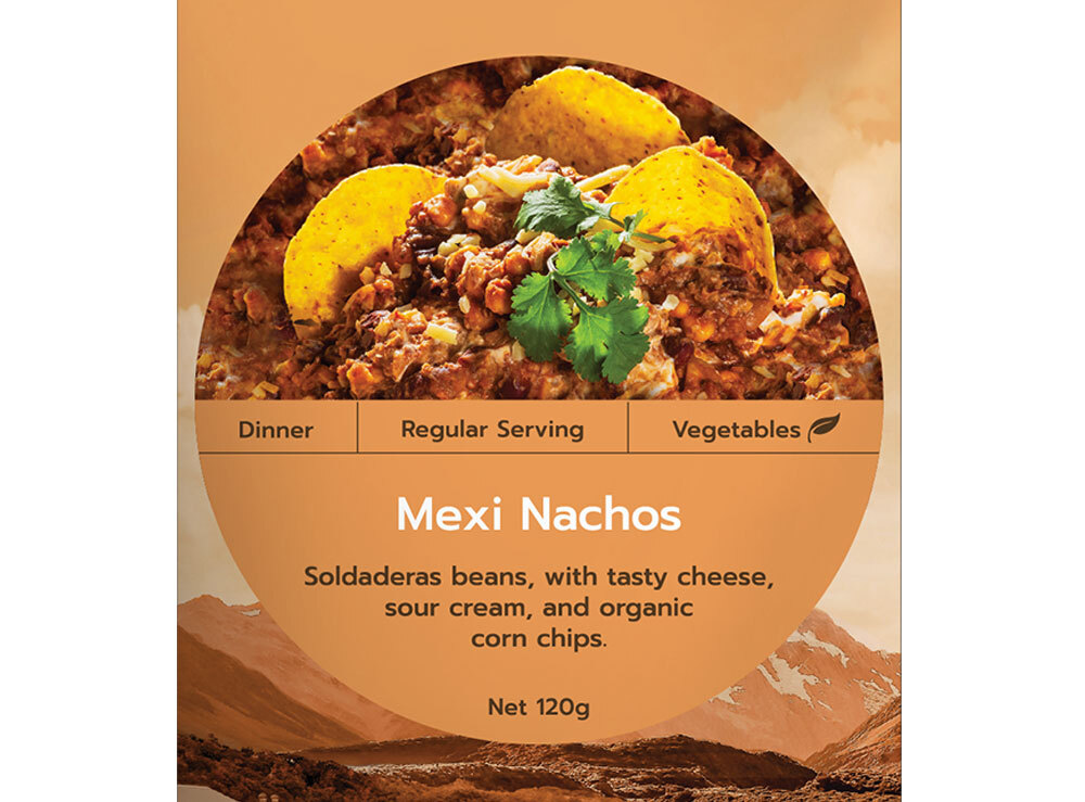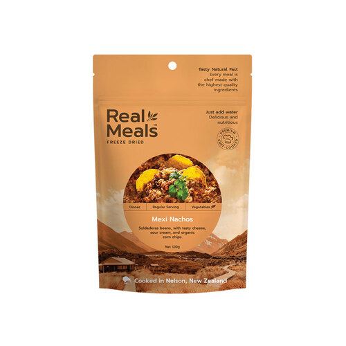 Real Meals Mexi Nachos includes soldaderas beans, with tasty cheese, sour cream, and organic corn chips.
