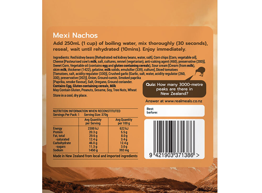 Red kidney beans [Rehydrated red kidney beans, water, salt], Corn chips [Corn, vegetable oil], Cheese [Pasteurised cow’s milk, salt, cultures, rennet (vegetarian), anti-caking agent (460), preservative (200)], Sweet Corn, Vegetable oil (contains egg and gluten containing cereals), Sour cream [Cream (from milk), skim milk, thickener (1422), gelatine, milk solids, emulsifier (339), culture], Diced tomatoes [Tomatoes, salt, acidity regulator (330)], Crushed garlic [Garlic, salt, water, acidity regulator (260, 330), preservative (202)], Onion, Ground cumin, Smoked paprika [Paprika, smoke flavour], Salt, Oregano, Ground coriander.