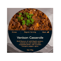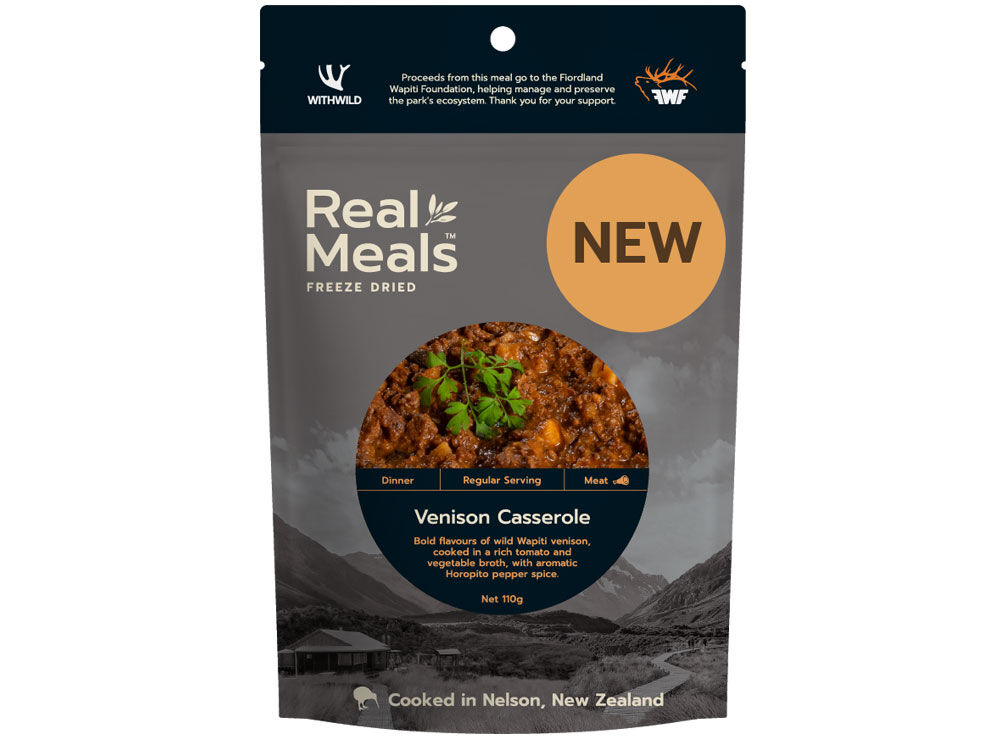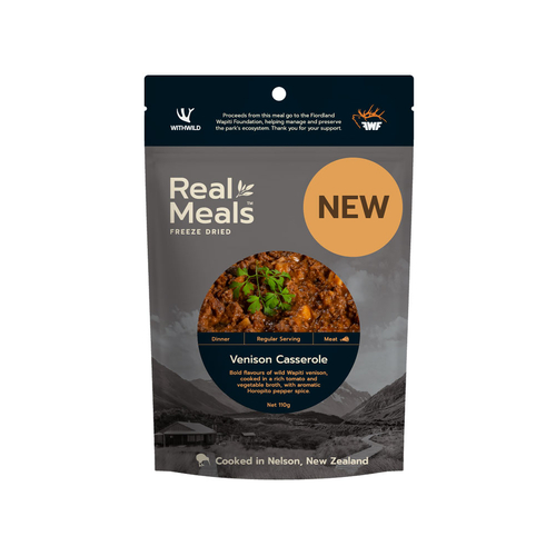 Real Meals Venison Casserole is a Wild Wapiti venison, in a rich tomato and vegetable broth with Horopito spice. Next level outdoor dining.