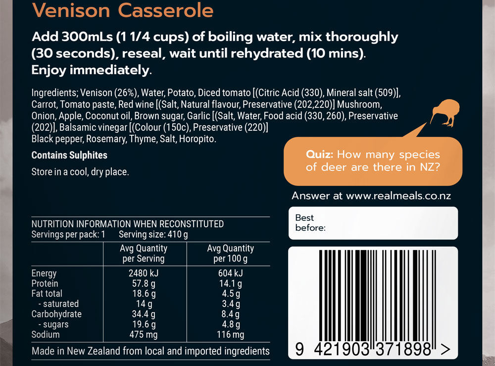 Venison (26%), Water, Potato, Diced tomato [(Citric Acid (330), Mineral salt, (509)], Carrot, Tomato paste, Red wine, [(Salt, natural flavour, Preservative (202,220)], Mushroom, Onion, Apple, Coconut oil, Brown sugar, Garlic [Salt, Water, Food acid (330,260), Preservative (202)], Balsamic vinegar [(Colour (150c), Preservative (220)], Black pepper, Rosemary, Thyme, Salt, Horopito.
