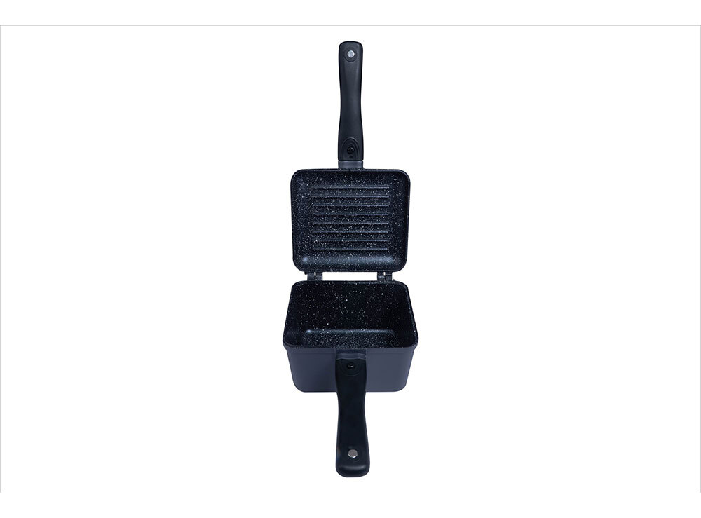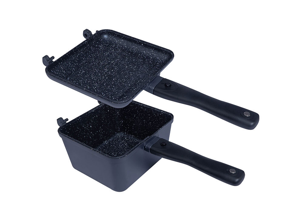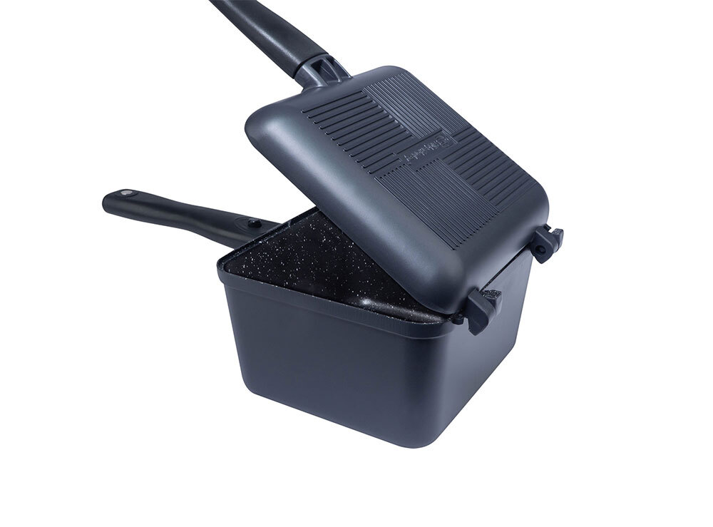 The RidgeMonkey Connect Deep Pan & Griddle Granite Edition features detachable cool-touch handles and a detachable hinge system that transforms one pan into two – a deep sided saucepan and a separate griddle pan.