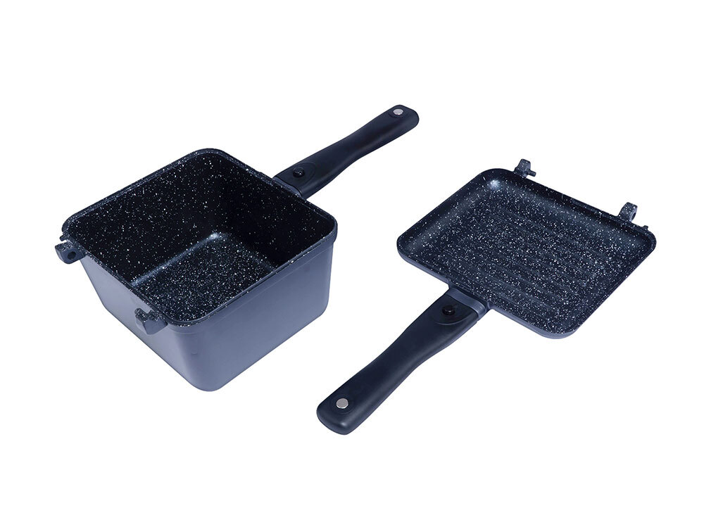 Includes: 1 x griddle pan, 1 x Deep Sided Saucepan, 1 x Set of Removable Magnetic, Thermoset Plastic Cool-Touch handles with Protective Pouch