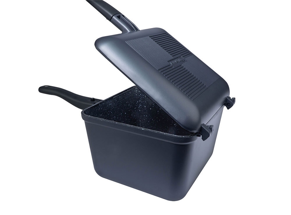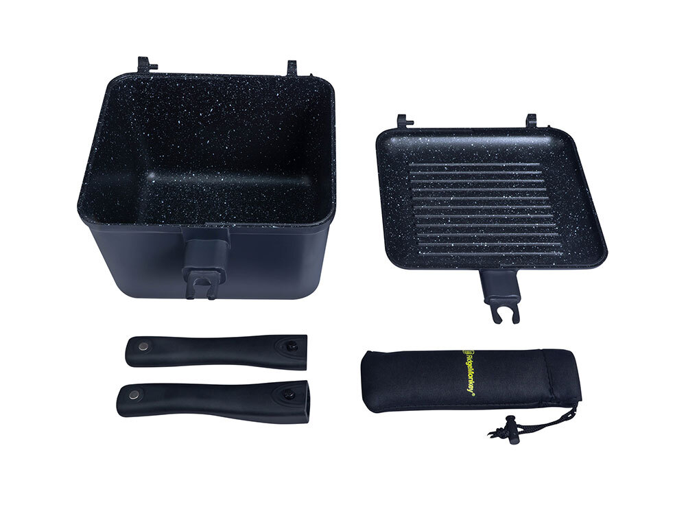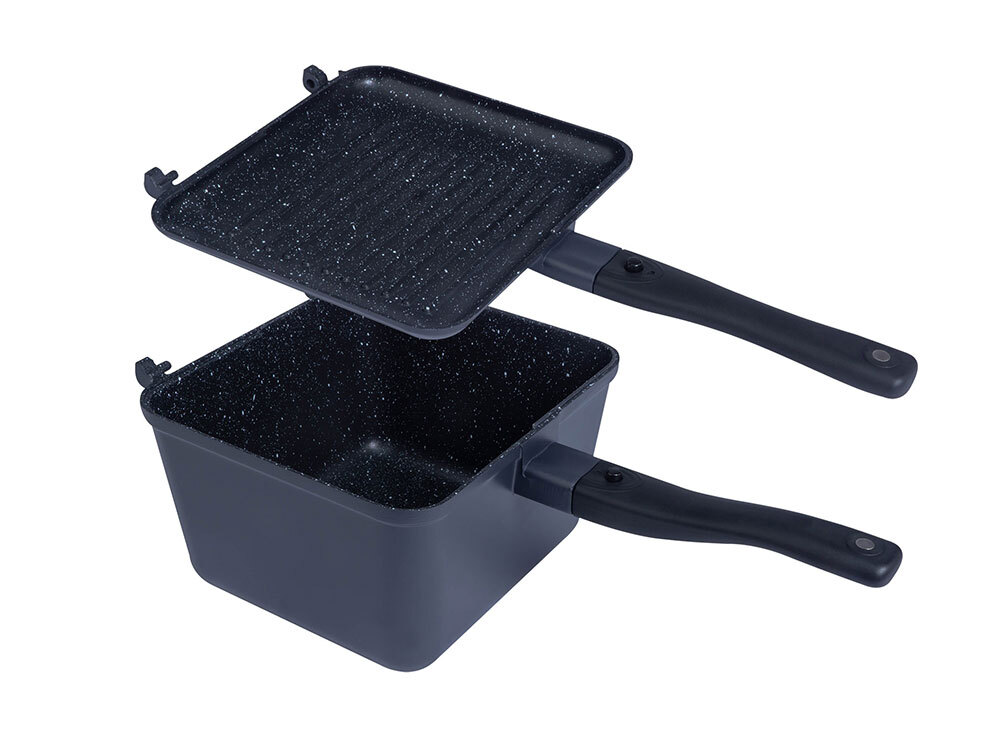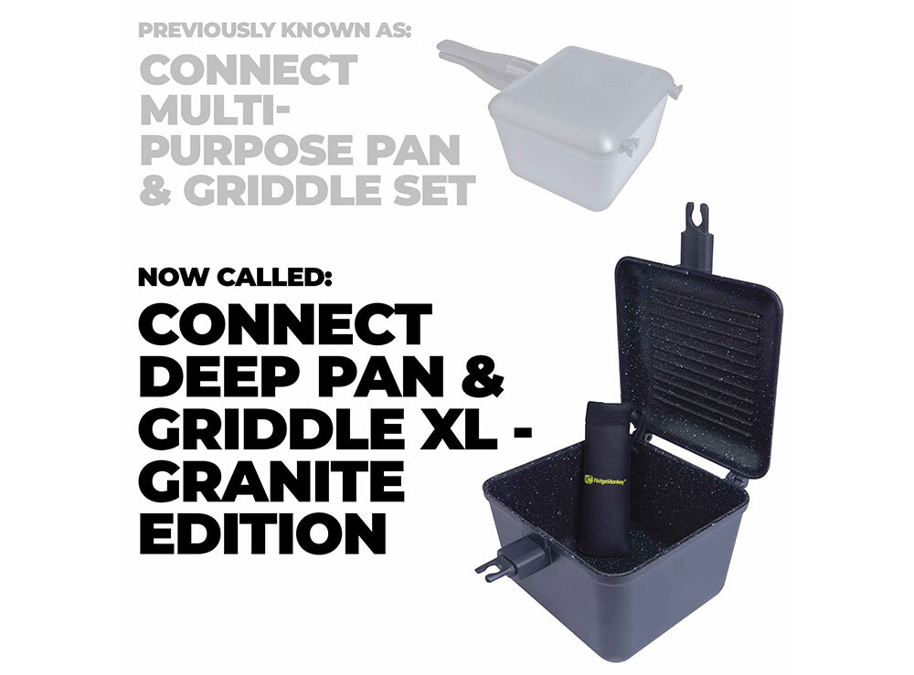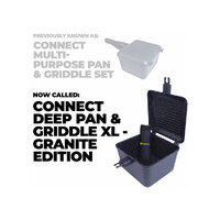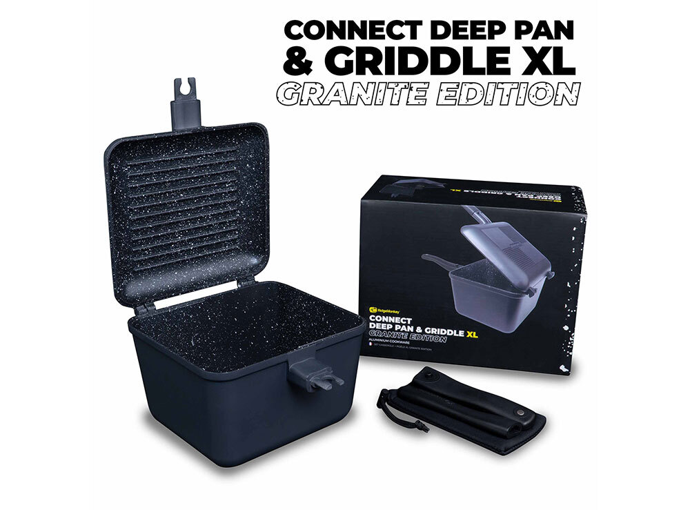 The RidgeMonkey Connect Deep Pan & Griddle XL Granite Edition features detachable cool-touch handles and a detachable hinge system that transforms one pan into two – a deep sided saucepan and a separate griddle pan.