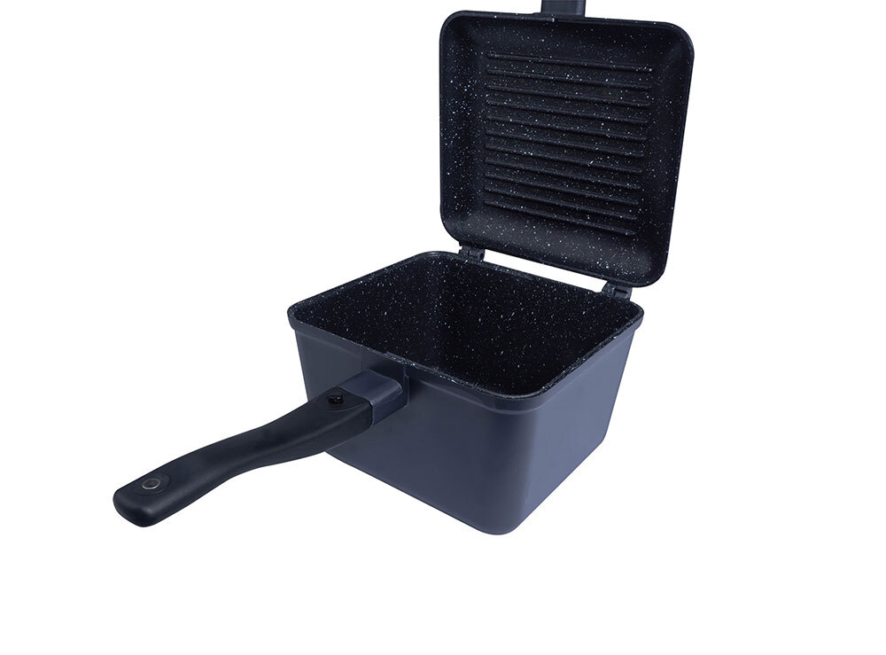 Includes: 1 x griddle pan, 1 x deep sided saucepan, 1 x set of removable magnetic, thermoset plastic cool-touch handles with protective pouch