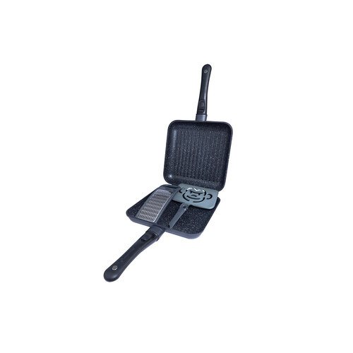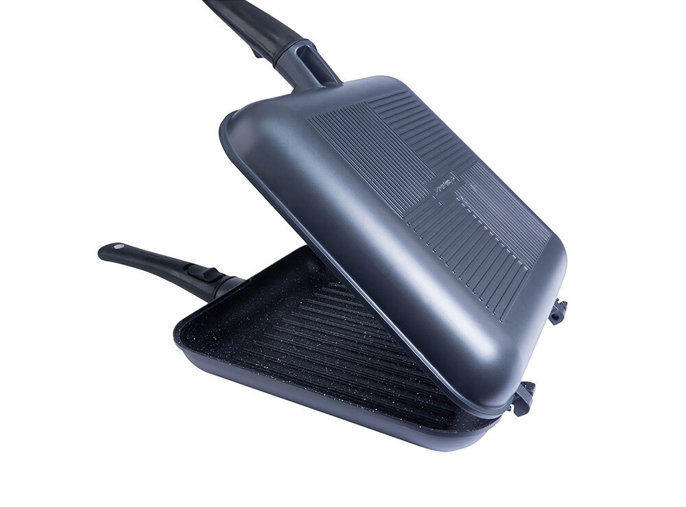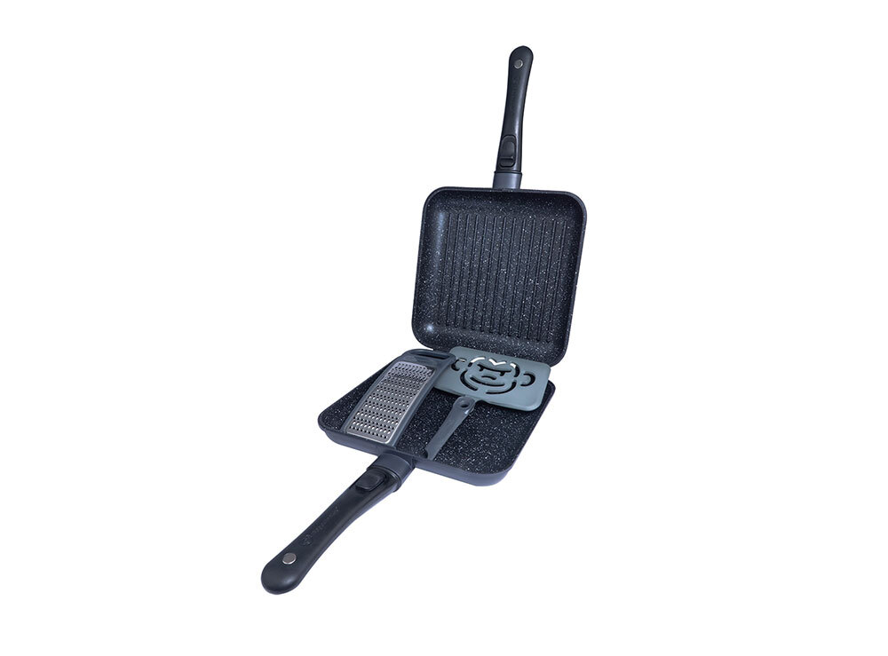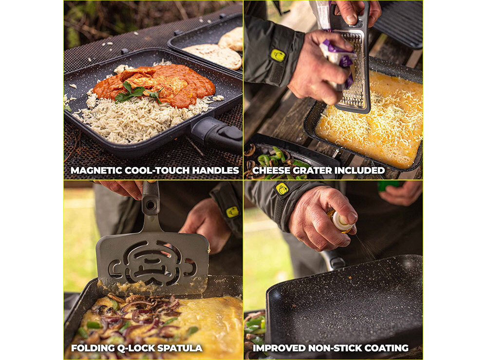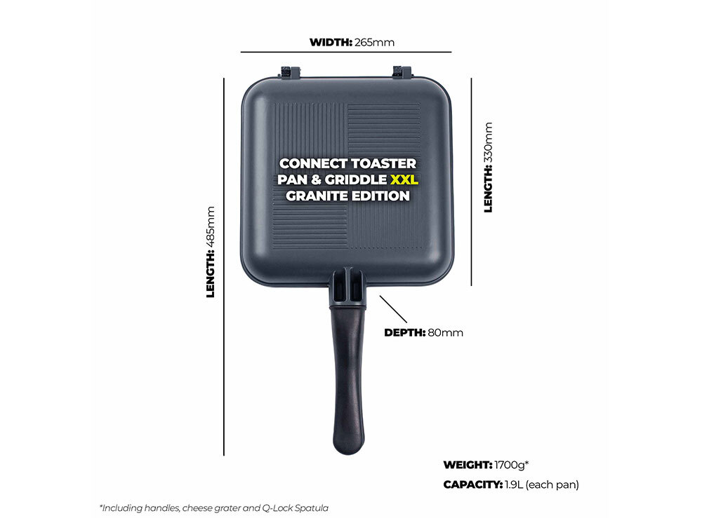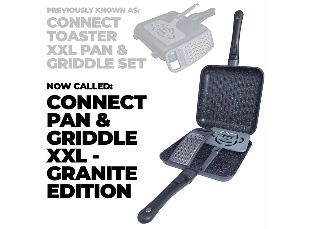 The Connect Pan & Griddle XXL Granite Edition features detachable cool-touch handles and a detachable hinge system that transforms one pan into two – a flat-bottomed pan and a separate griddle pan. The Connect Pan & Griddle XXL also comes with a cheese grater and a large Q-Lock Spatula.