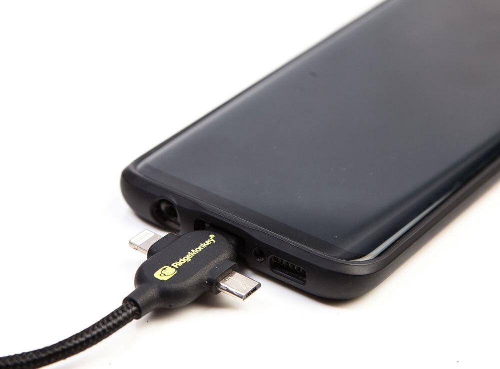 The RidgeMonkey Vault USB-A to Multi Out Cable 1m is compatible with almost all modern 5V devices and perfect for home or travel: featuring USB-C, Micro-USB and Lightning output connectors. Use this cable to connect the USB-A output port of the Vault C-Smart, Solar Panel or Car Charger Adaptor to the majority of modern 5V devices.