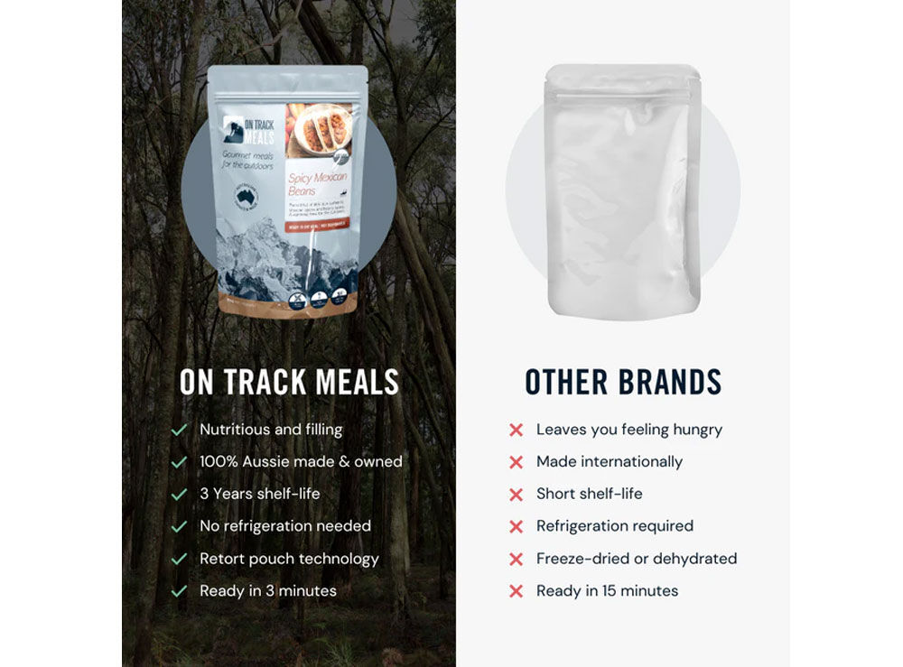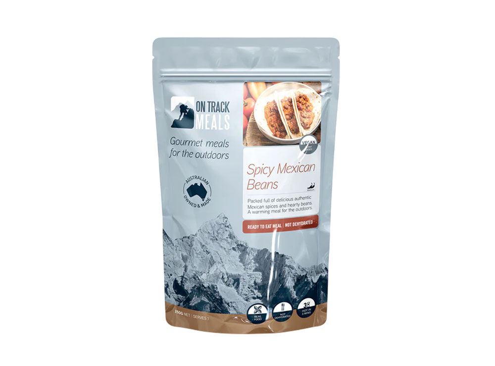 The On Track Spicy Mexican Beans Ready-to-Eat Meal is a bold, spicy mix of tomatoes and beans that delivers rich flavour in every bite. This satisfying vegan meal is perfect served over rice or wrapped in a burrito for an easy, hearty option at camp, on the road, or in your emergency food kit.
