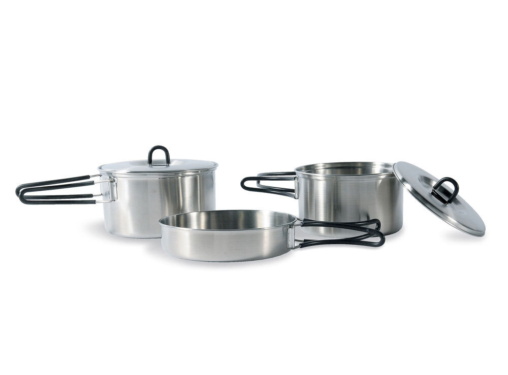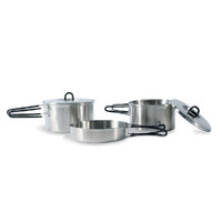 Cookset comprises a pan with folding handle and two pans with folding handle and lid. This set is made out of 18/8 stainless and will happily accommodate most requests in an outdoor kitchen. 18/8 stainless steel is durable, food safe and easy to clean.