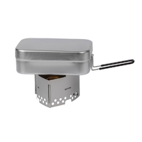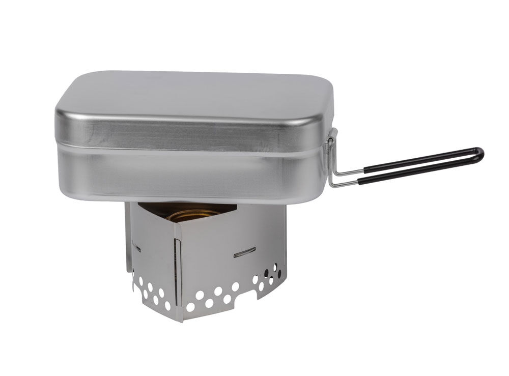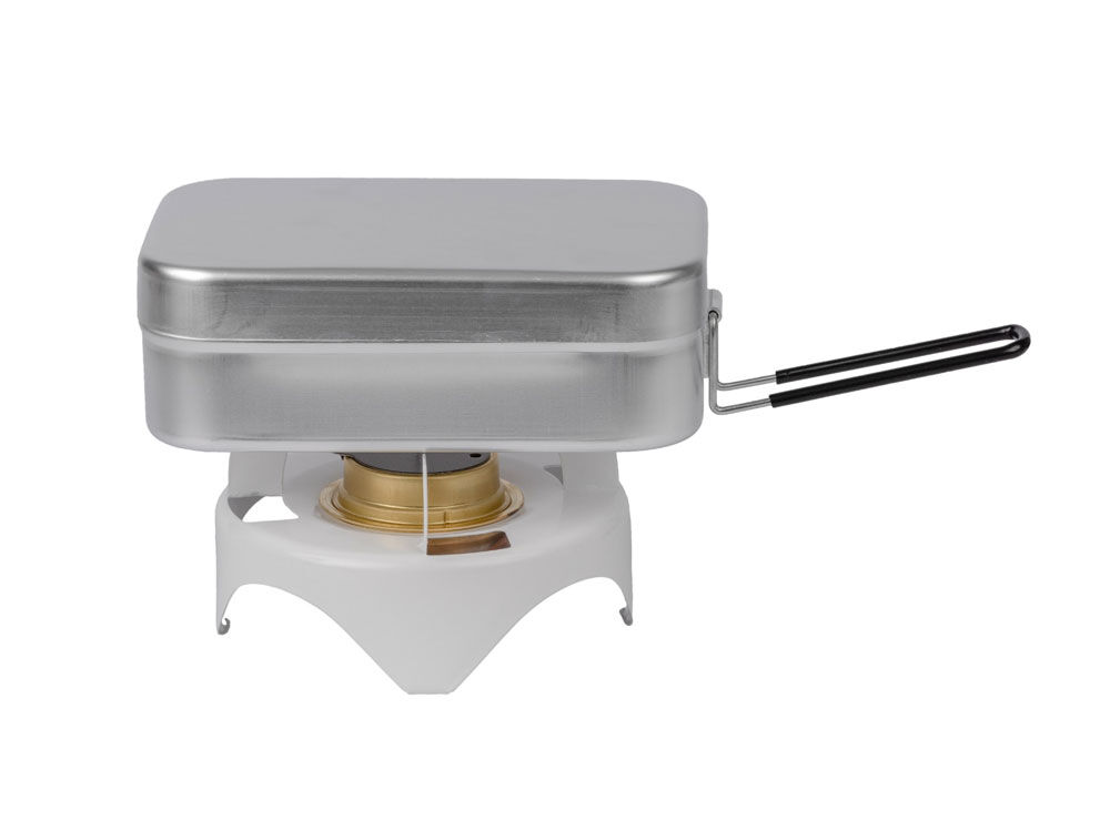 - Folding Handle: The main tin features a hinged, folding black handle that securely locks into place for cooking and eating. The handle folds flat against the body for extremely compact storage.