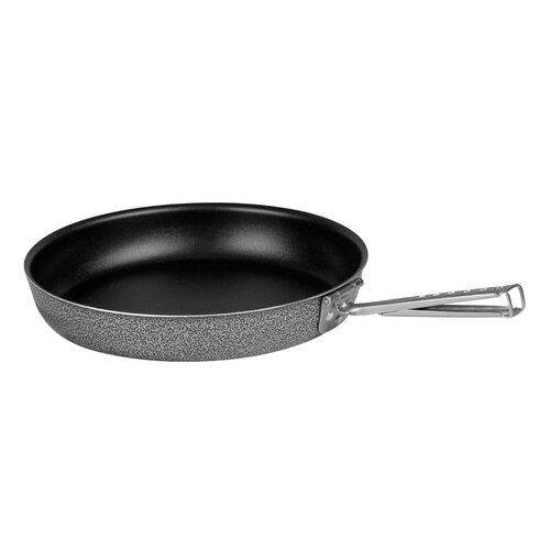 Ultralight Non Stick Aluminium frypan with attached hinged steel handle that folds into the frypan for convenient storage.