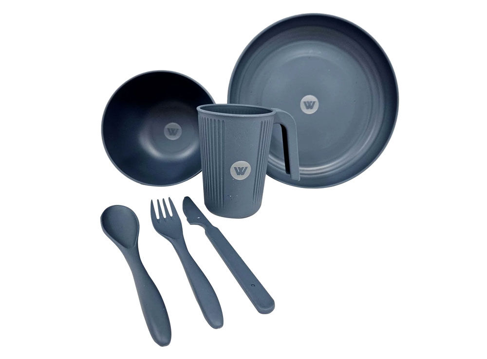 The Wildtrak 1 Person Wheat Straw Dinner Set in a calming Blue shade is the perfect sustainable dining solution for the solo camper, backpacker, or office lunch taker.