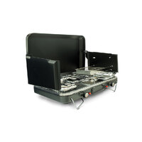 The Zempire 2 Burner Deluxe Stove is a portable and easy-to-use camping stove. The drop-down toaster is perfect for breakfast time and can be folded away when not needed, while the stainless steel drip tray makes clean up easy. The no-fuss suitcase design packs down small and features a wrap-around windshield and locking legs that create a stable platform on most surfaces.