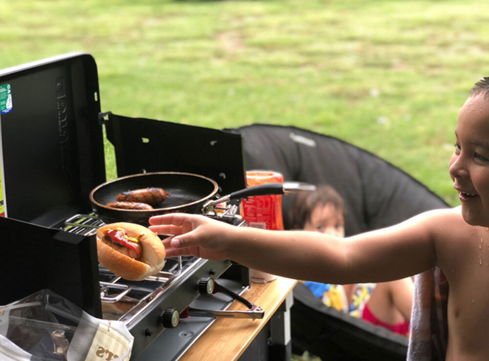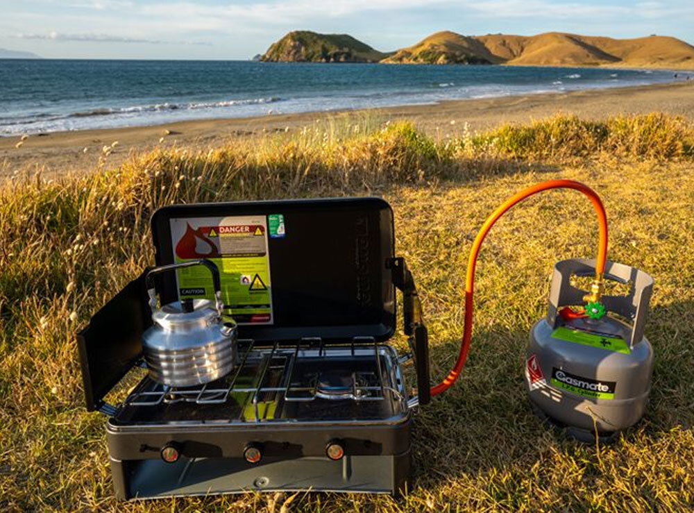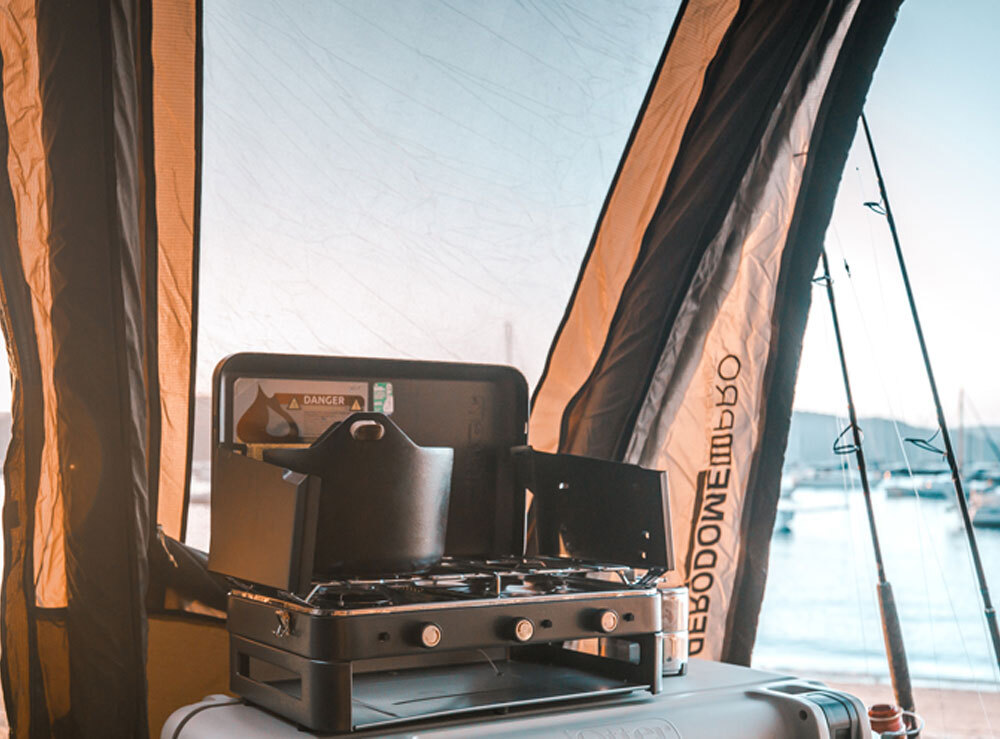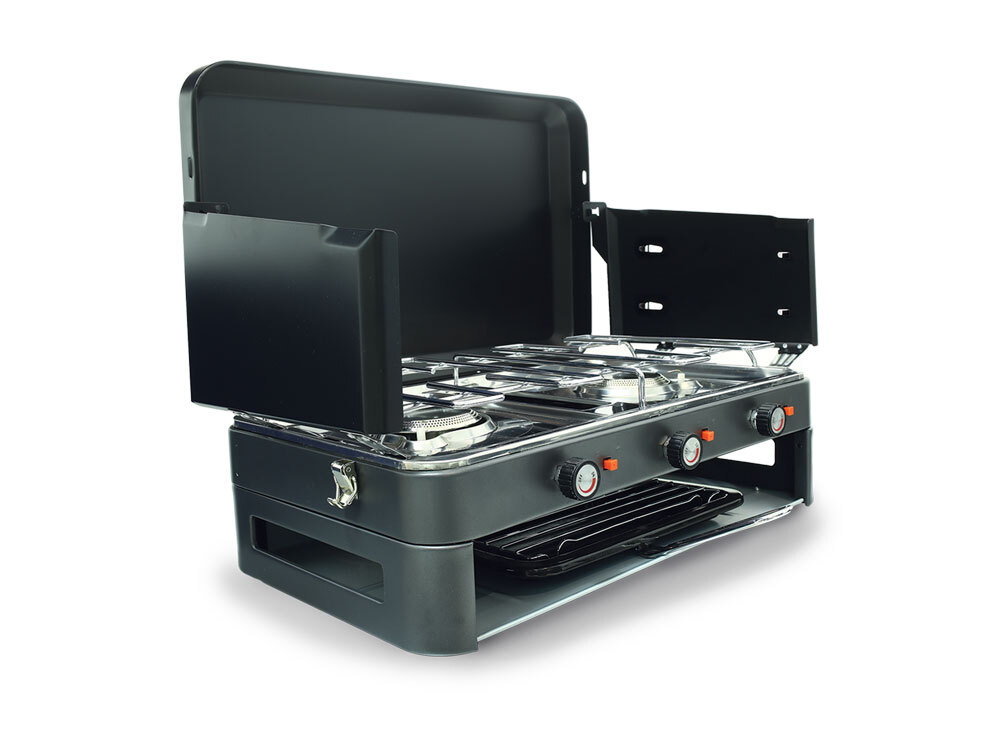 The Zempire 2 Burner Deluxe with Grill is the complete solution for campsite cooking. Featuring two 12000BTU burners and a powerful lower grill, each with push-button piezo ignition. The lower grill/toaster is perfect for toasted sandwiches or grilling meat and vegetables. A stainless steel drip tray simplifies clean up and the wrap-around windshield folds and locks in place for transport and storage.