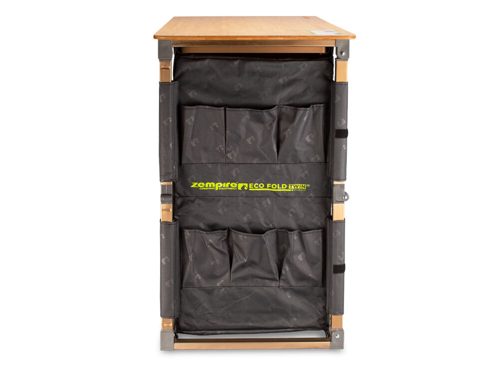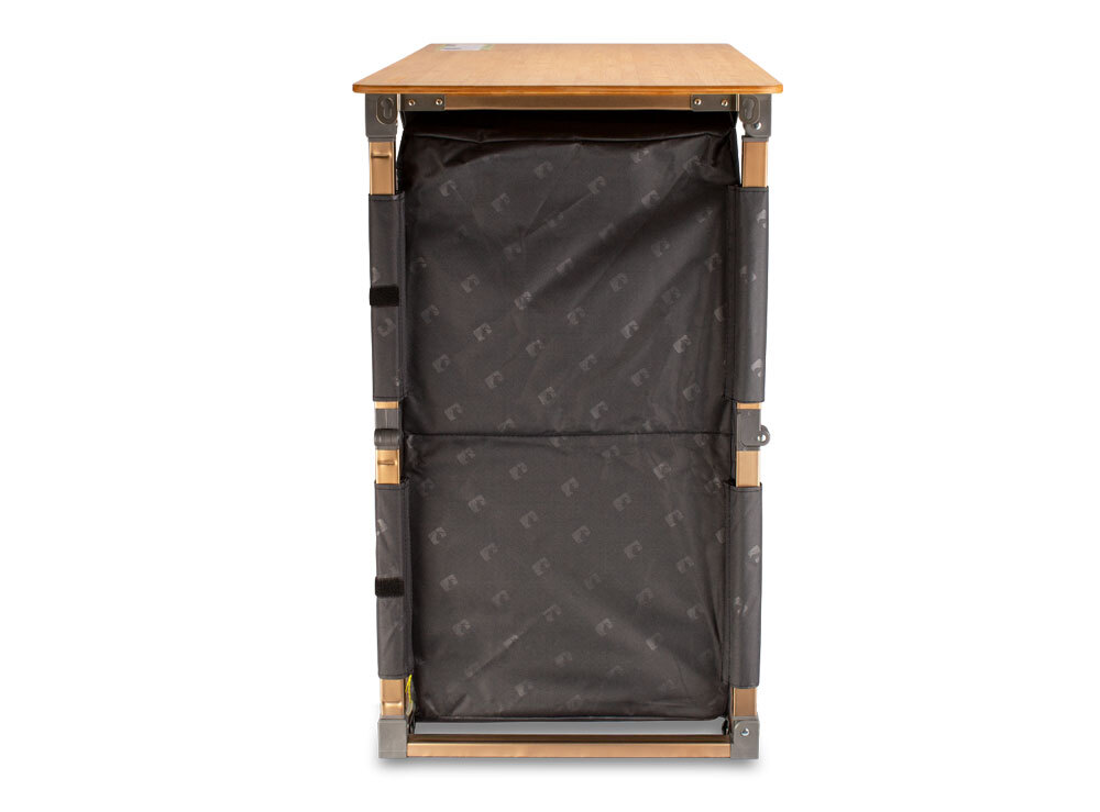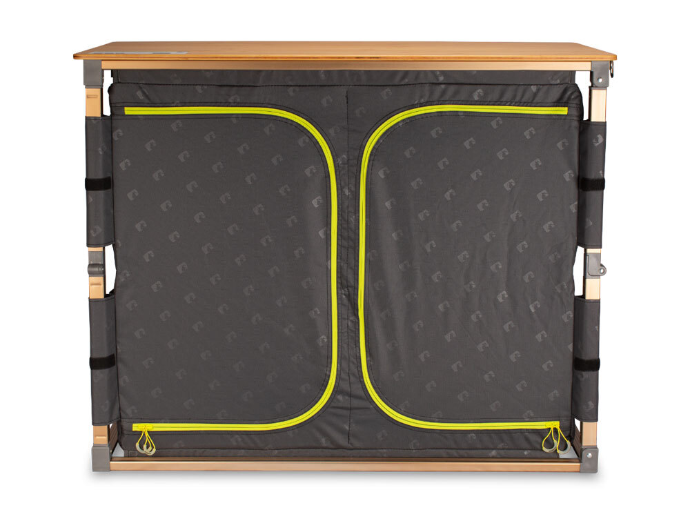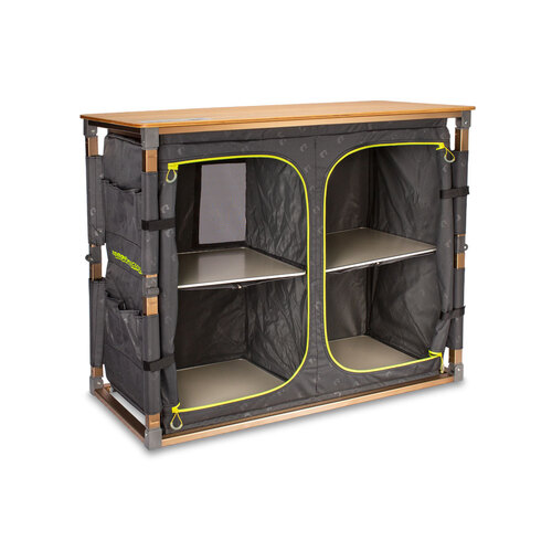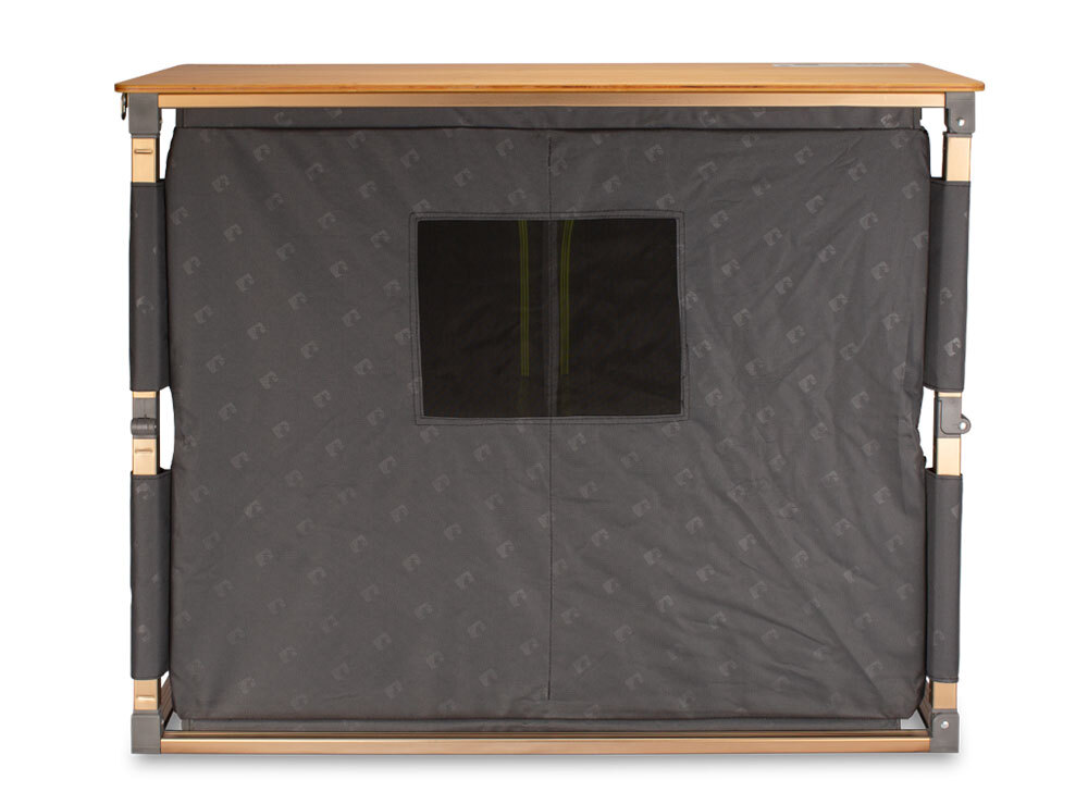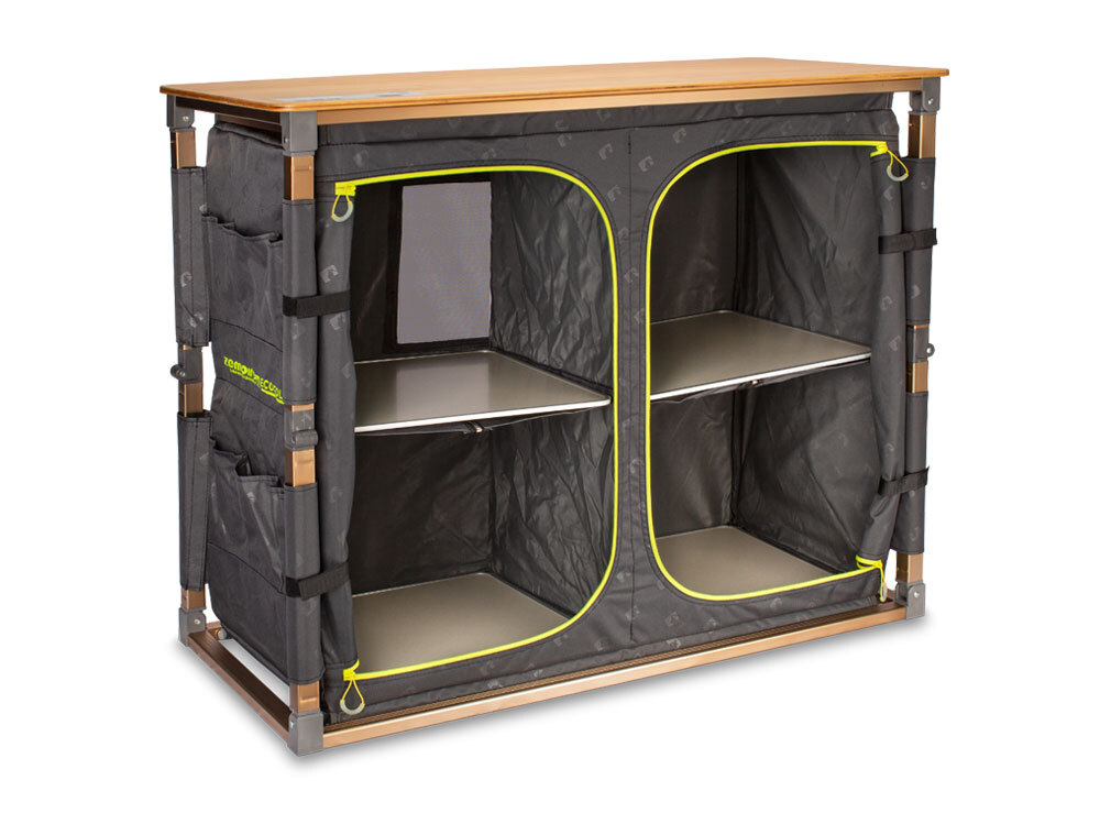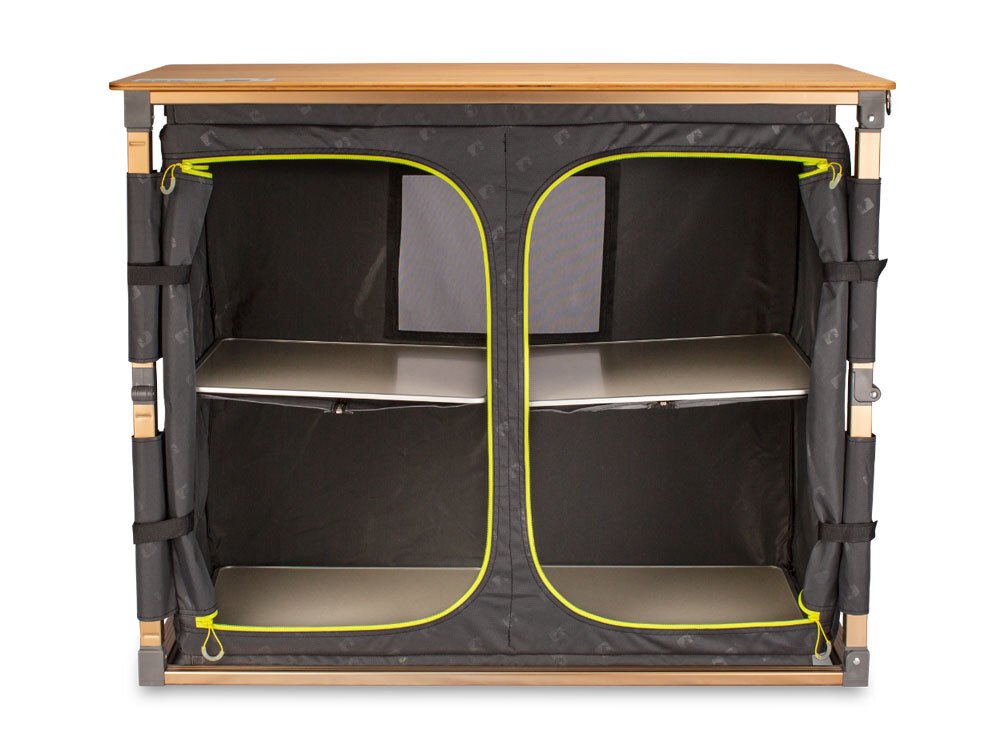 A perfect working surface to cook and prepare camp meals. The twin lower cupboards, along with side storage pockets, help to help keep your campsite organized. A retractable utility rack keeps utensils close at hand and can also store a basin for wash-up.