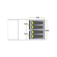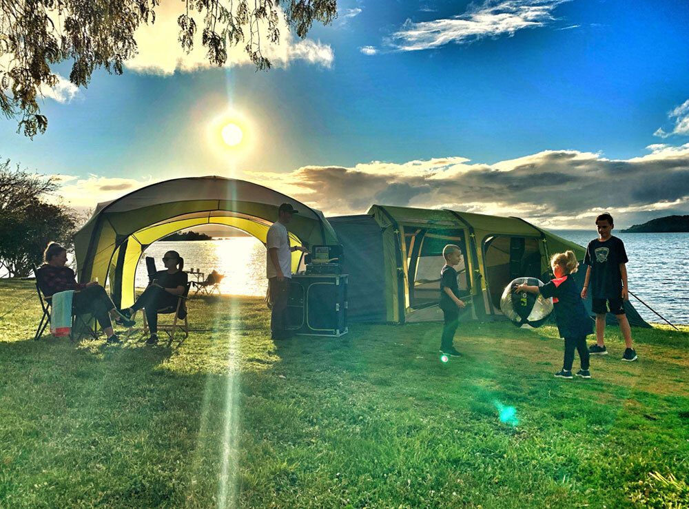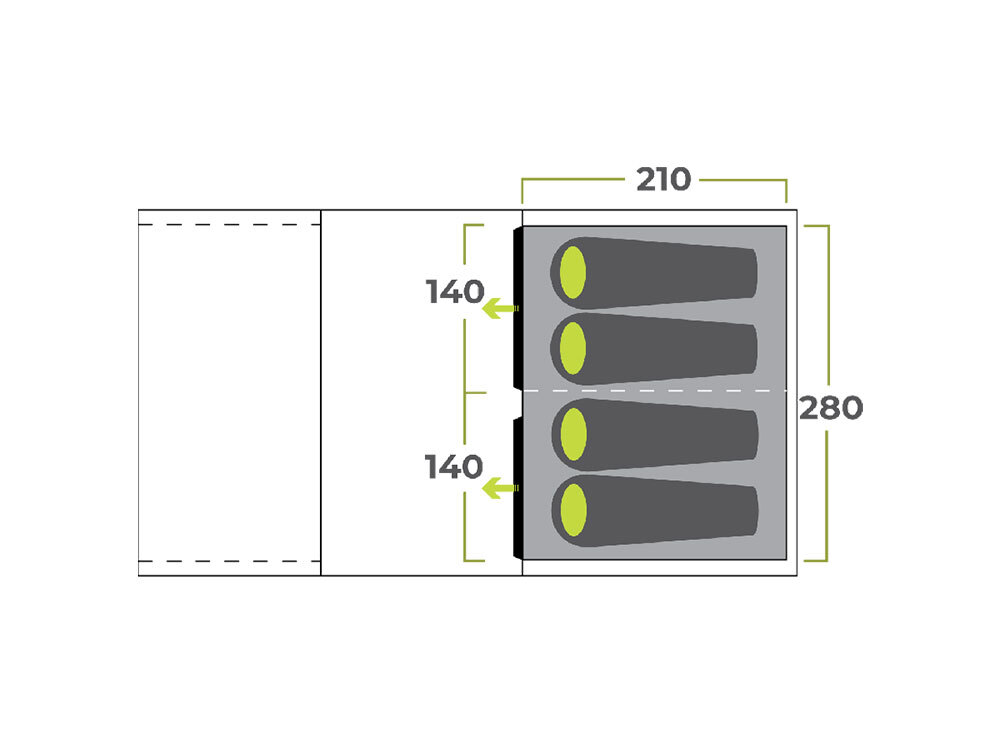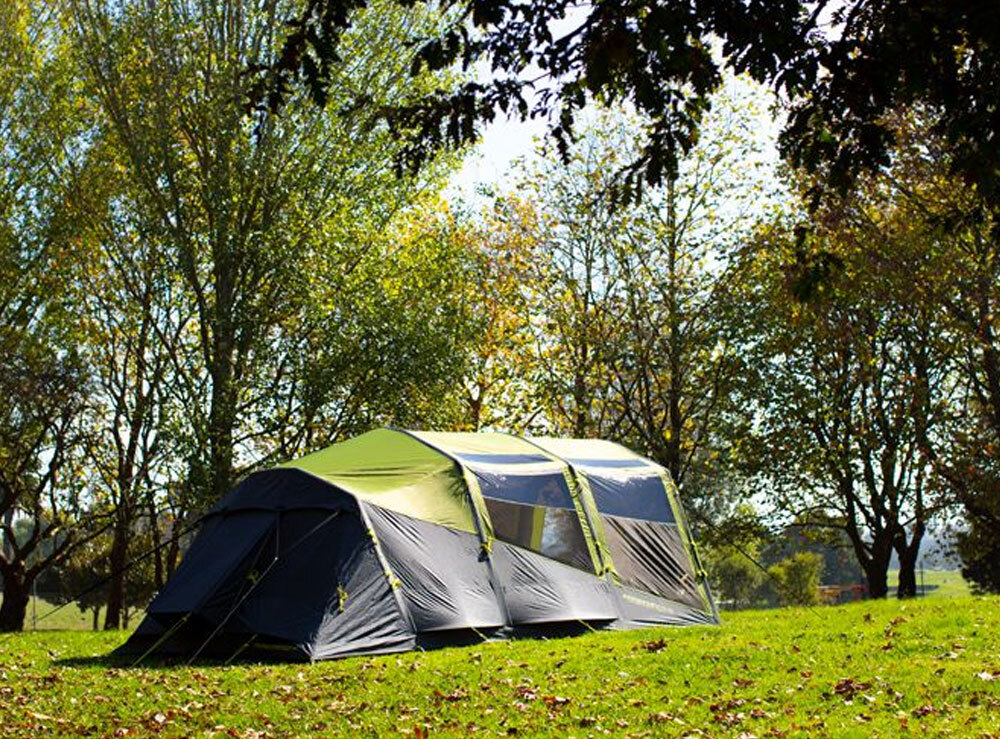 A light-diffusing bedroom fabric ensures uninterrupted sleep on lazy mornings and the angled beam construction offers improved wind stability and headspace throughout the tent.