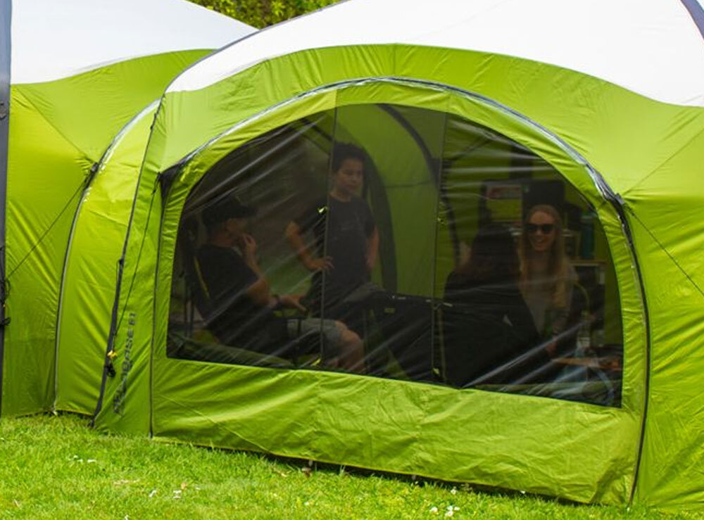 Internal window covers open for additional airflow and zip close for weather protection. Centrally placed door toggles allow you to roll back and secure the wall half-way for easy entry and exit.