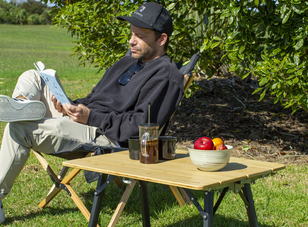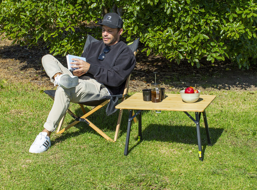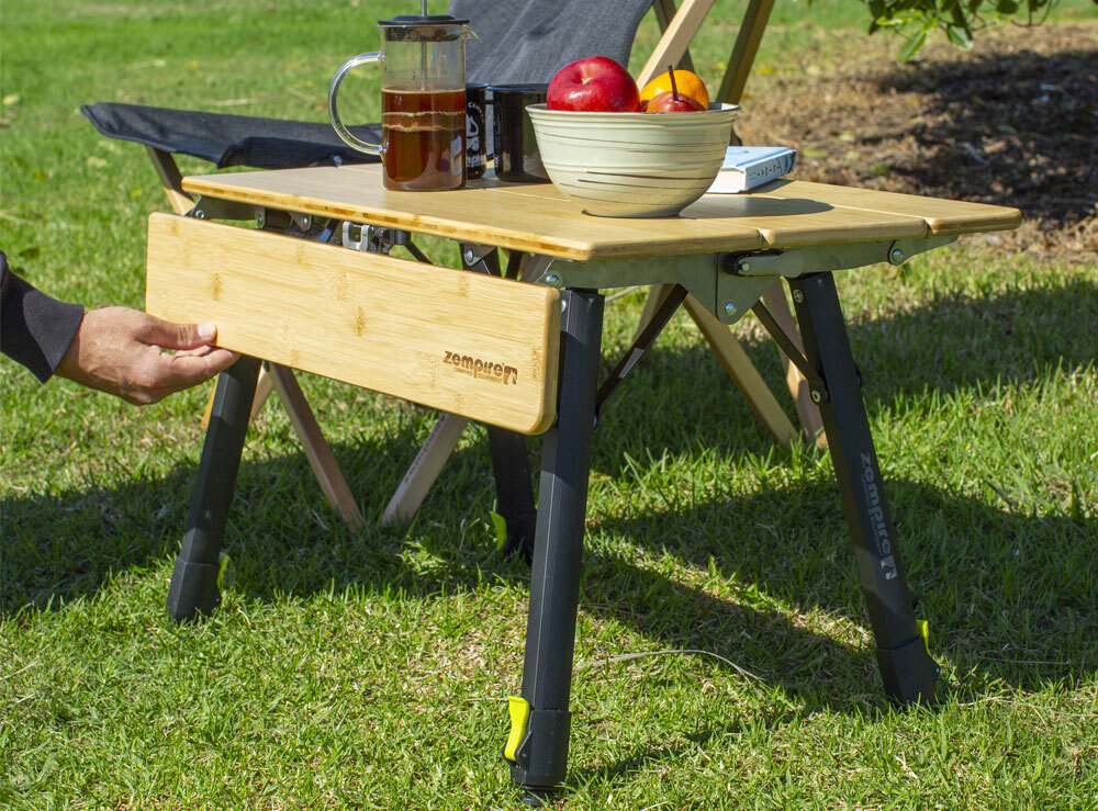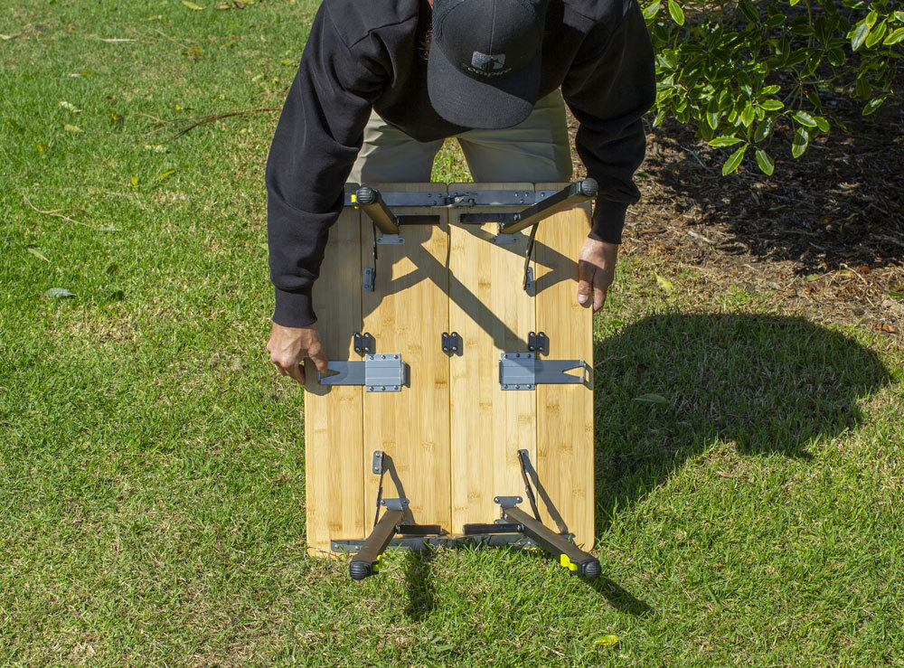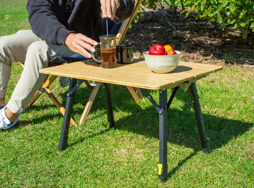 New this season, the Zempire Kitpac Pro Standard Camping Table is built with a new aluminium frame, making for an even sturdier table with minimal movement. The natural bamboo tabletop is much thicker than previous models but just as smooth and heat resistant.