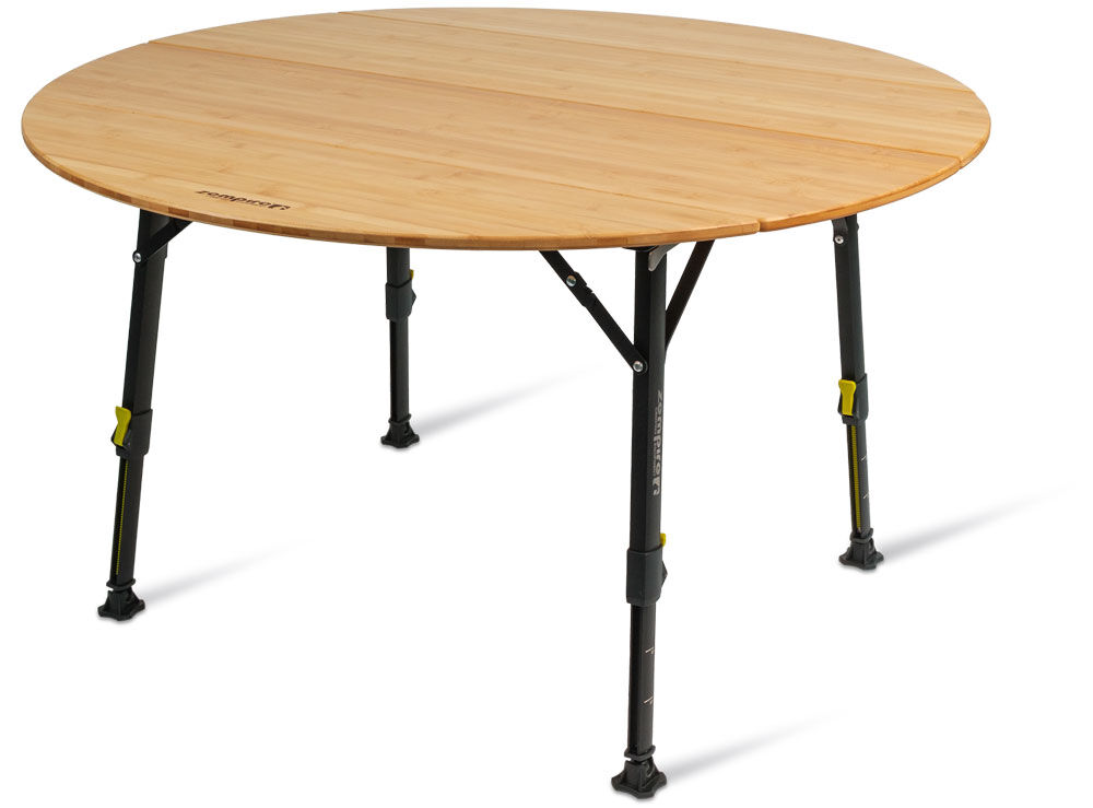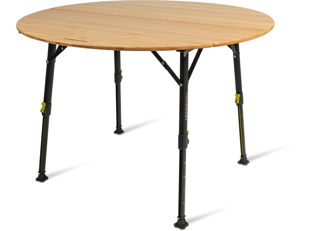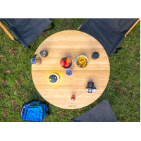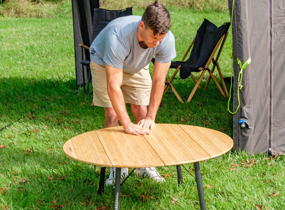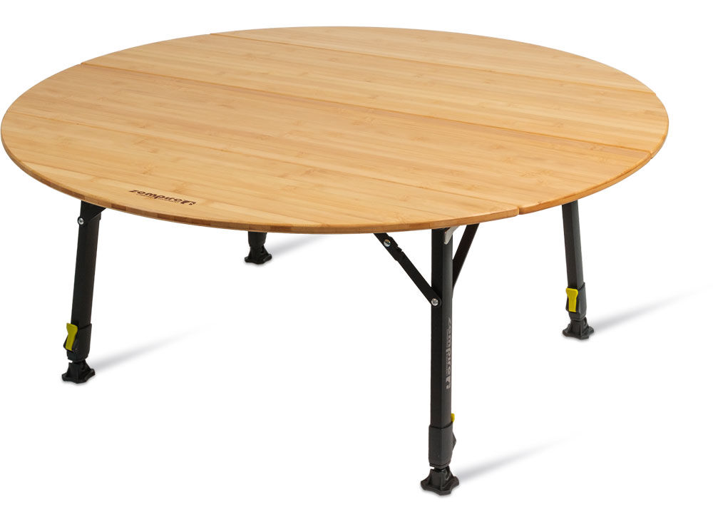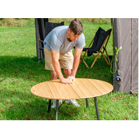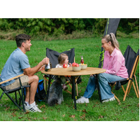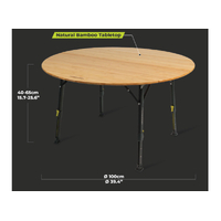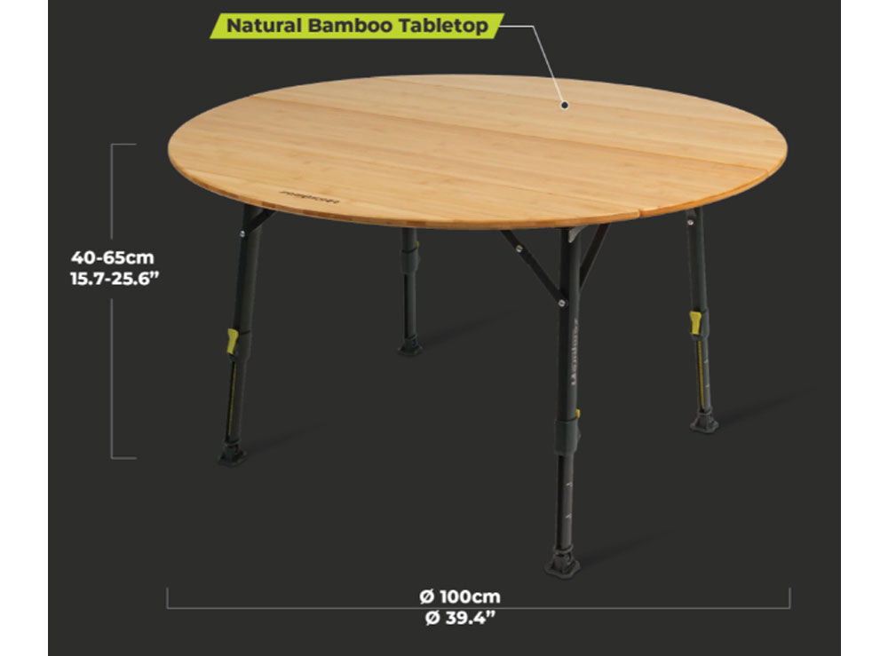 With a unique round design, strong aluminium frame, natural bamboo tabletop, adjustable height, and compact fold-down function, this table is perfect for campsite meals, drinks, games and more. Includes a built-in bottle opener for added convenience.