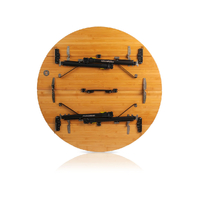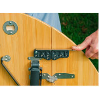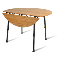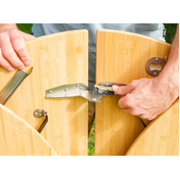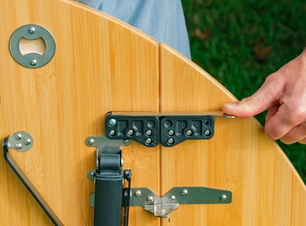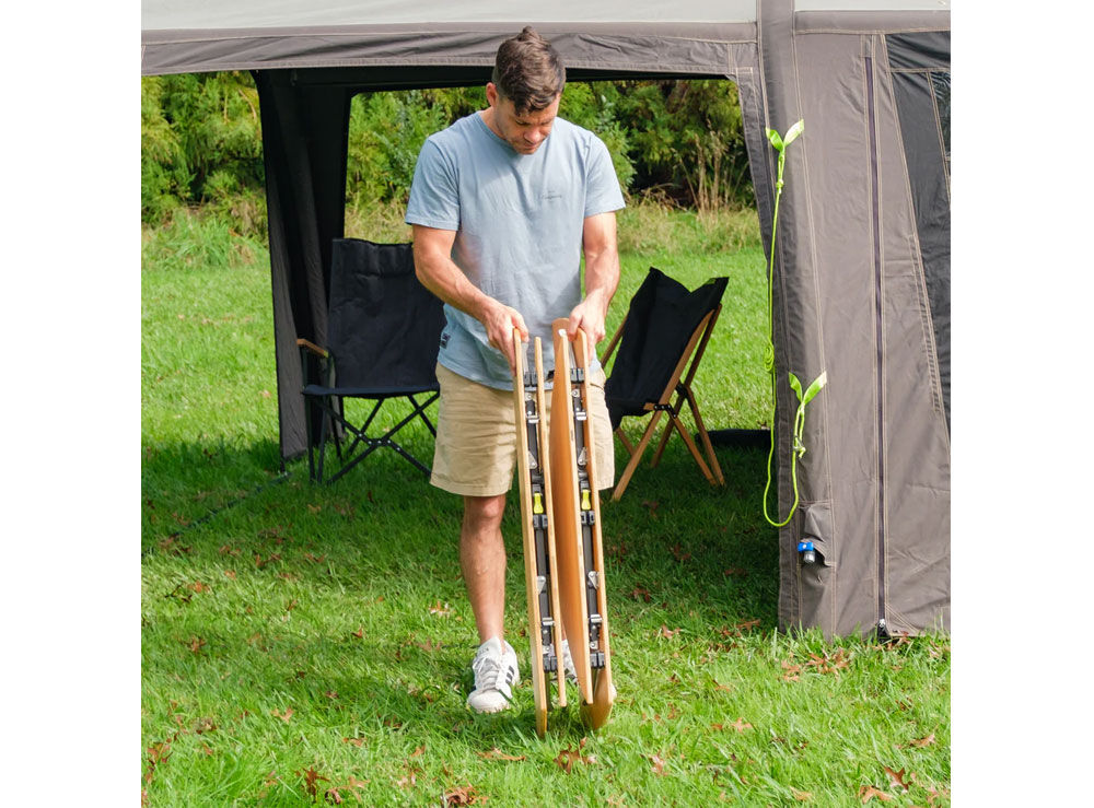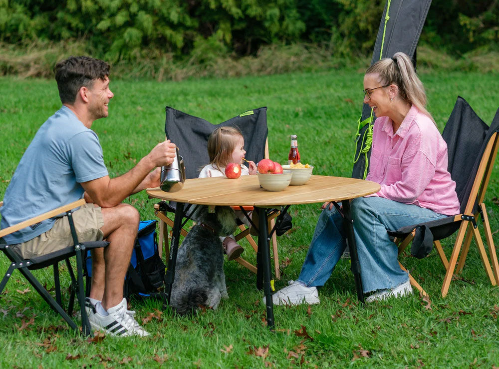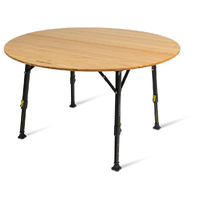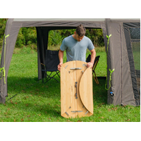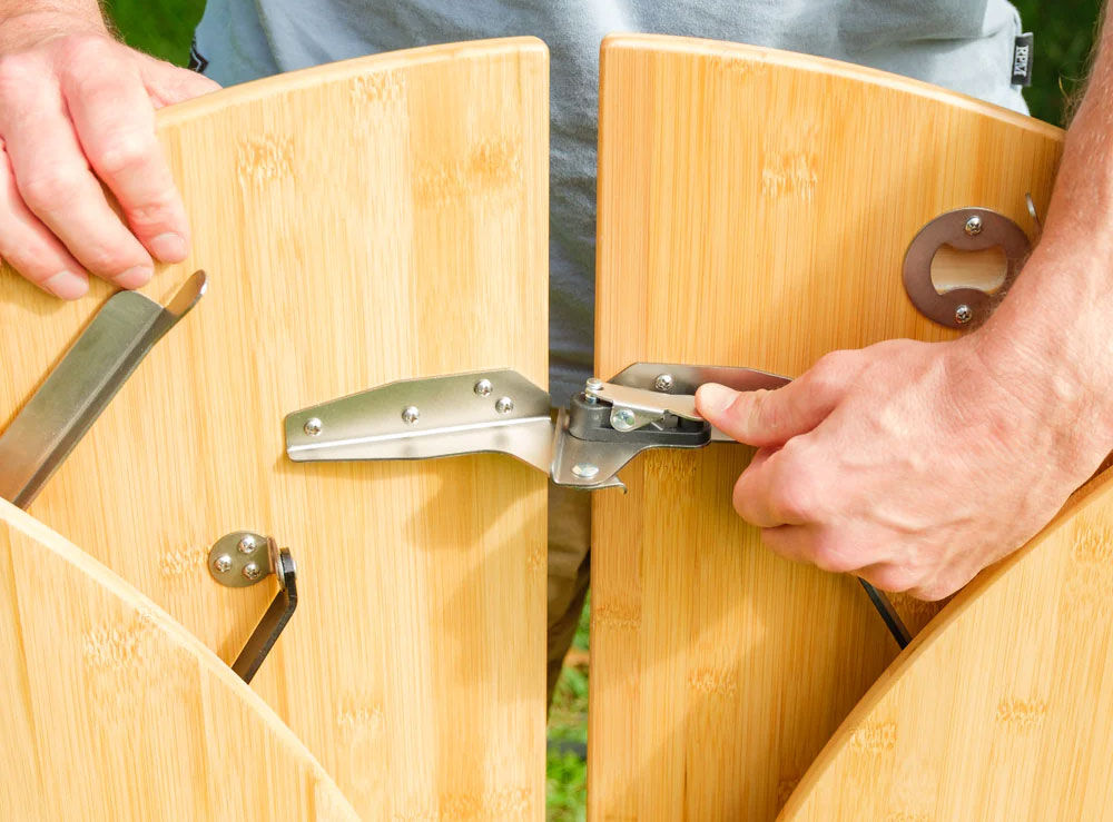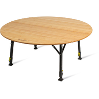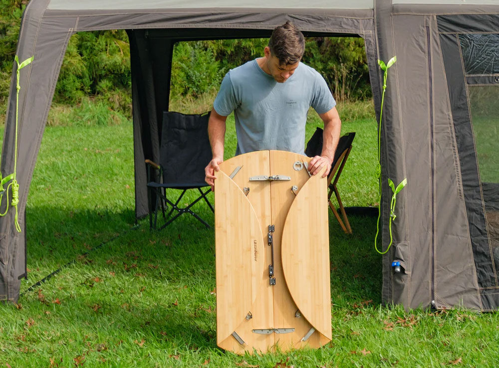 With a unique round design, strong aluminium frame, natural bamboo tabletop, adjustable height, and compact fold-down function, this table is perfect for campsite meals, drinks, games and more. Includes a built-in bottle opener for added convenience.