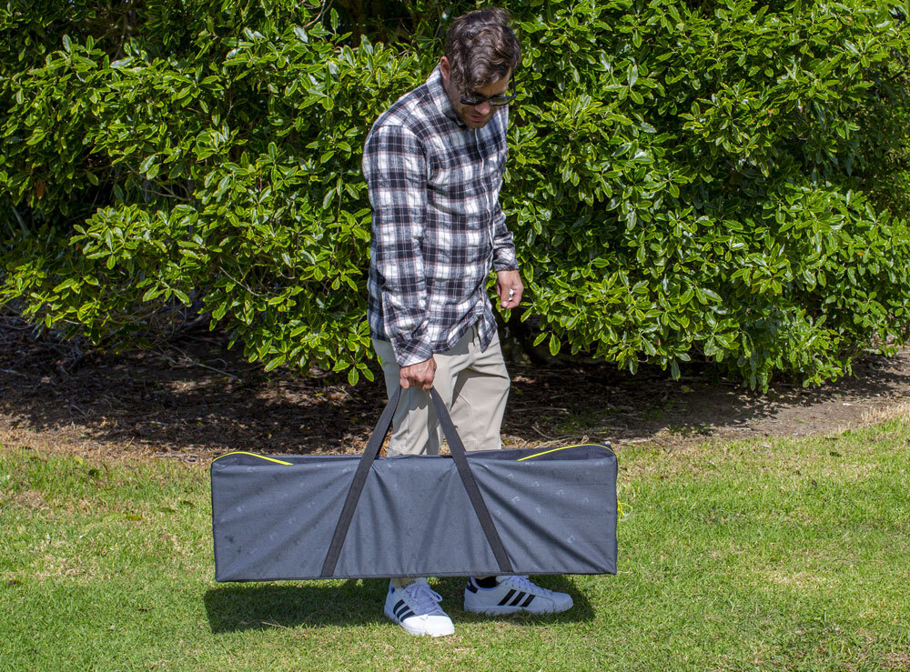The table height is easily adjustable and can be locked in place with a simple lever on each leg. The Kitpac Pro X-Large folds down to a super compact size, fitting neatly into a durable carry bag for effortless transport.