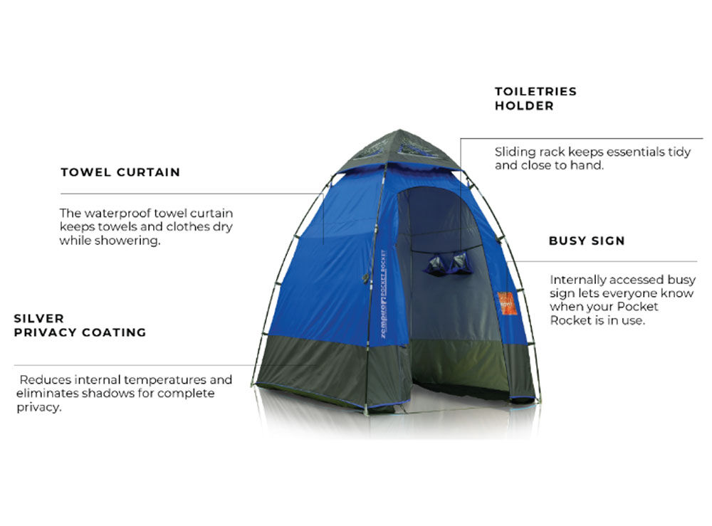 - Solar shower attachment | The tall profile and secure anchor point at the top makes the Pocket Rocket and ideal mobile shower unit for the campsite