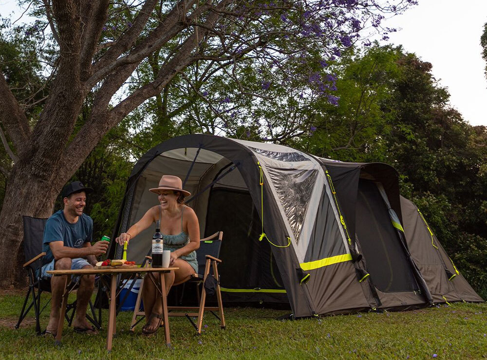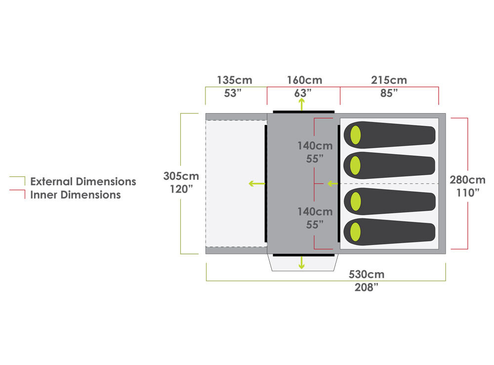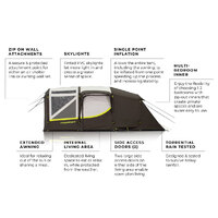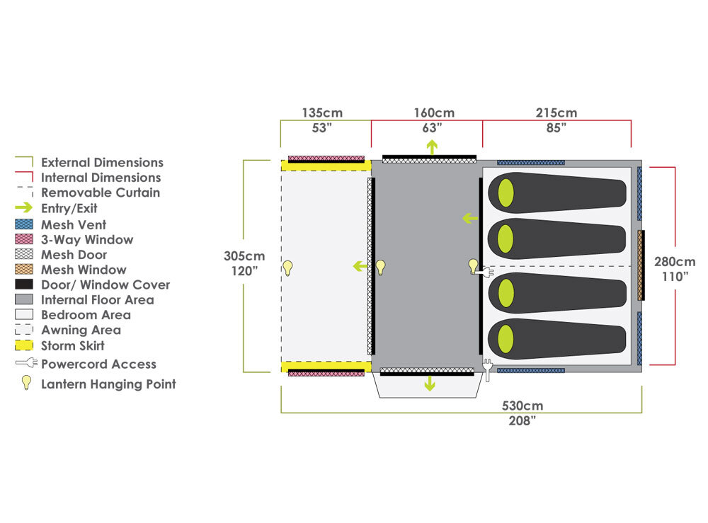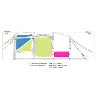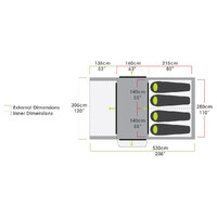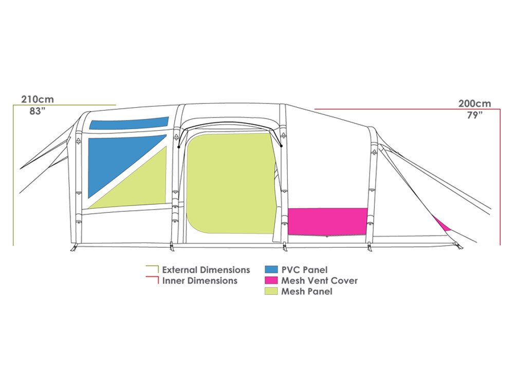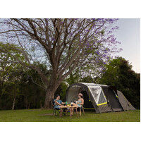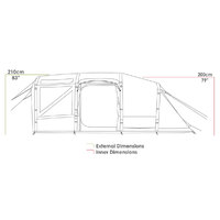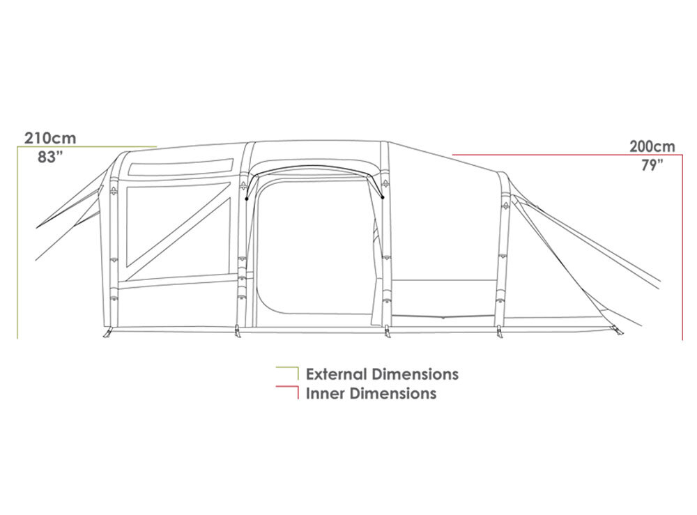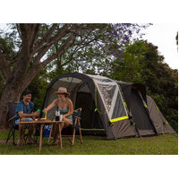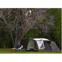 Capacity: 4 Recommended Capacity: 3+ Living space Number of bedrooms: 2 Living Areas: 1 Inflation Speed: Under 2 minutes Type of Frame: Inflatable Air Frame Frame Material: Inflatable air system tubes, 7001 aluminium (7.9mm) brow pole Tent Material: 210D, 130T Poly Oxford with 420D Ripstop Grid Fly Fabric: 210D, 130T, poly oxford with 420D ripstop grid Inner Material: 75D, 260T breathable polyester Waterhead Rating: 8,000mm Number of Doors/Entry Points: 3 Awning Entry Points: 1 Number of Windows: 5 Number of Ventilation Points: 11 UV Rating: UPF 50+ Floor Material: 14x14, 180gsm Polyethylene Peak Height: Inner: 200cm Fly: 210cm Internal Floor Area: 12.0 m2 Bedroom Area: 6.02 m2 Living Area: 4.88 m2 Awning Area: 4.12 m2 Weight: 30.8 kg Dimensions: 530cm (L) x 305cm (W) x 210cm (H) Packed Dimensions: 80cm(L) x 46cm (W) x 46cm (H) PFAS Free: YES Warranty Period: 4 years Carry Bag Material: 210D, 130T poly oxford with 420D ripstop grid