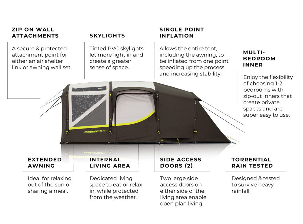 Entire tent can be inflated in under 2 minutes and features Zempire's most durable and waterproof polyester materials