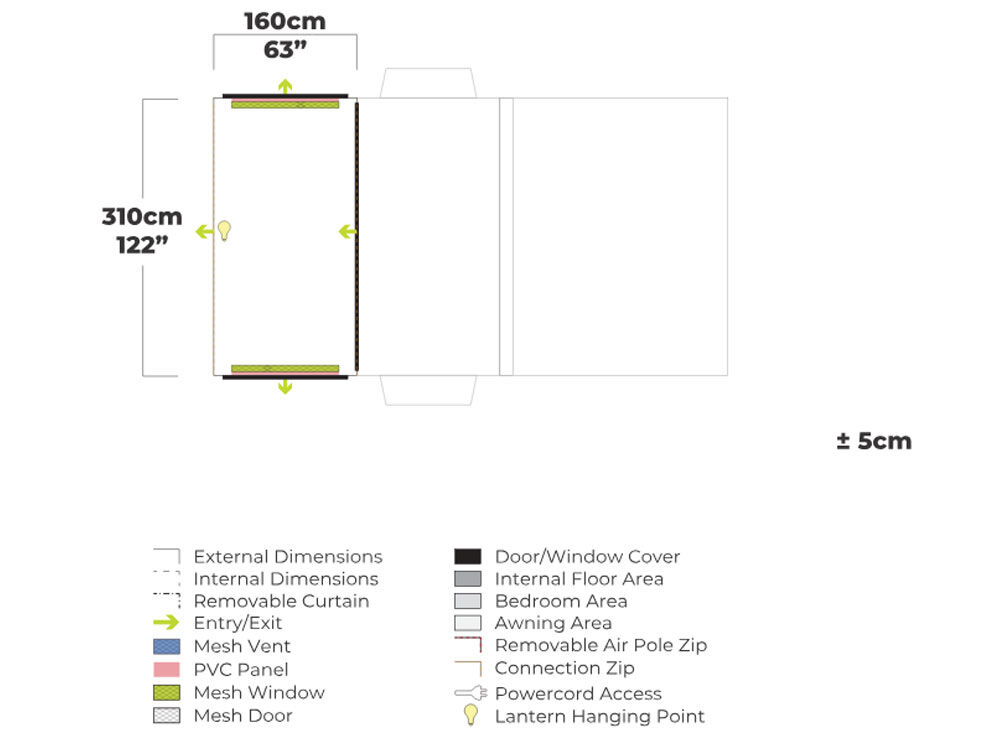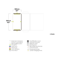 Floor dimensions: 160 x 310 cm - no floor, optional zip in groundsheet available