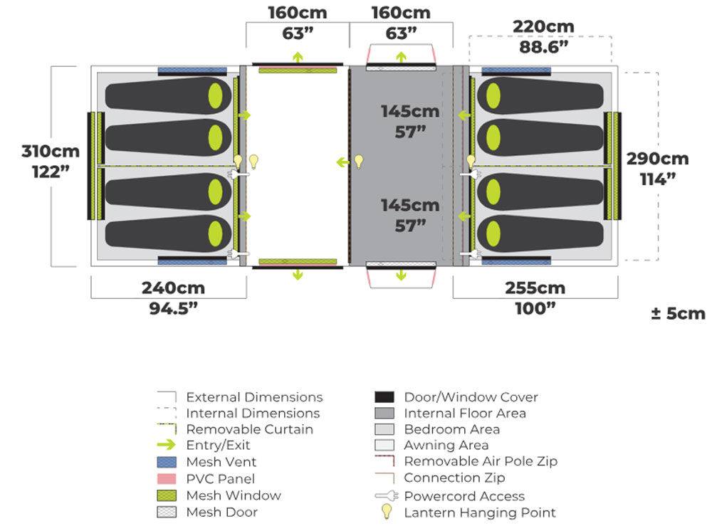 - 2 x Zempire Shapeshifter 4 Sleeping Modules: Comfortable, dedicated sleeping quarters for up to four people. Designed for privacy and weather protection.