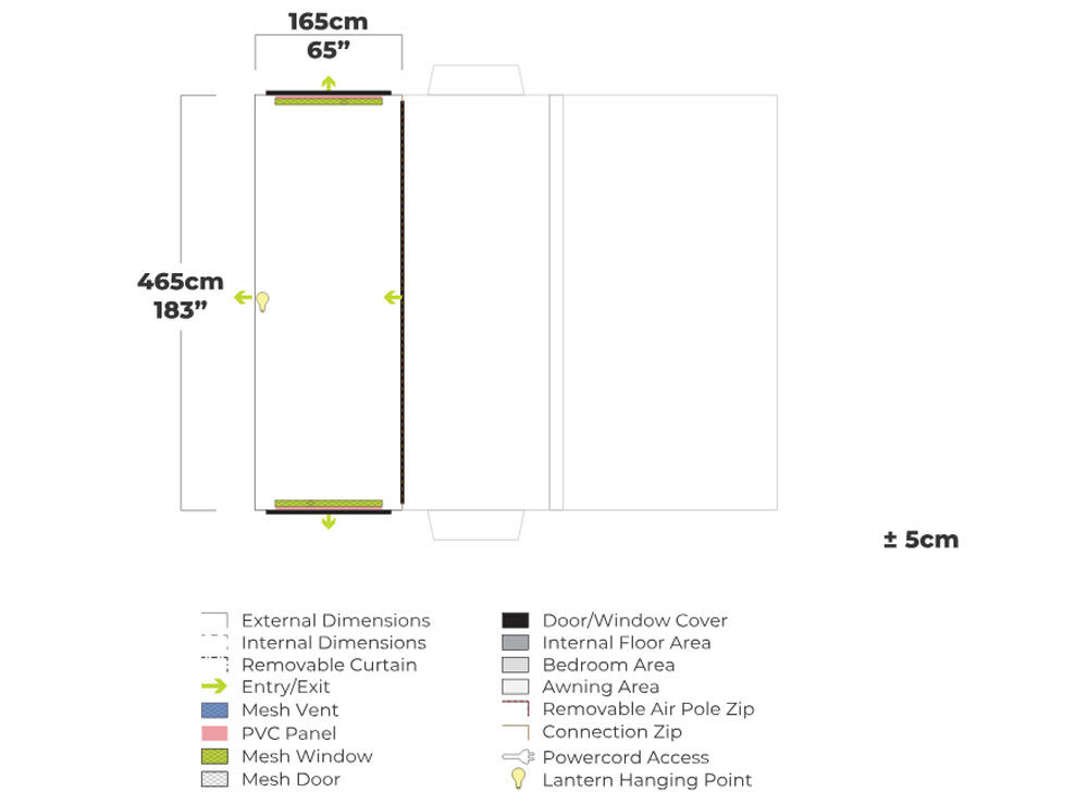 Floor dimensions: 165 x 465 cm - no floor, optional zip in groundsheet available